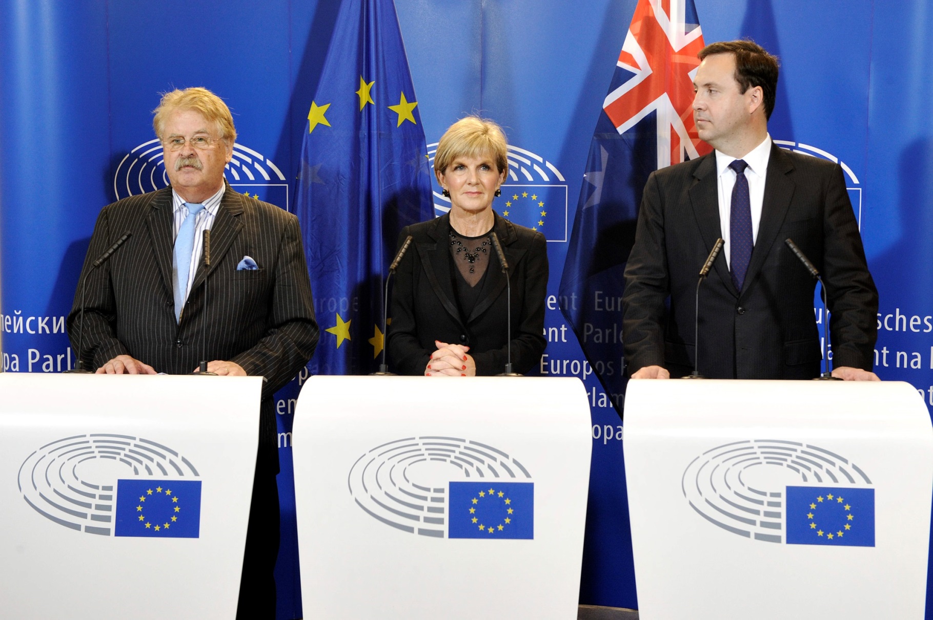 Foreign Minister Julie Bishop participates in a press conference with the Chair of the European Parliament’s Committee on Foreign Affairs, Mr Elmar Brok, and the Hon Steven Ciobo, the Australian Minister for Trade, Tourism and Investment. Photo credit: DFAT/Fred Guerdin