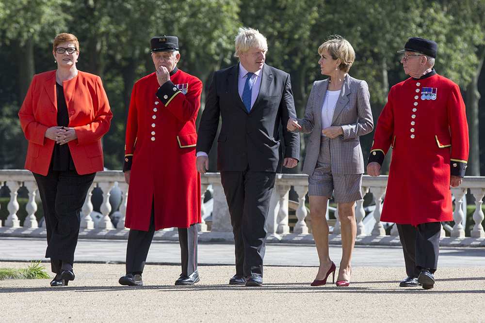 Foreign Minister Julie Bishop, UK Foreign Secretary Boris Johnson, Australian Defence Minister Marise Payne, and Chelsea Pensioners on a tour of the Royal Chelsea Hospital, venue of the 2016 AUKMIN meet-ing in London. Photo credit: Jim Ross