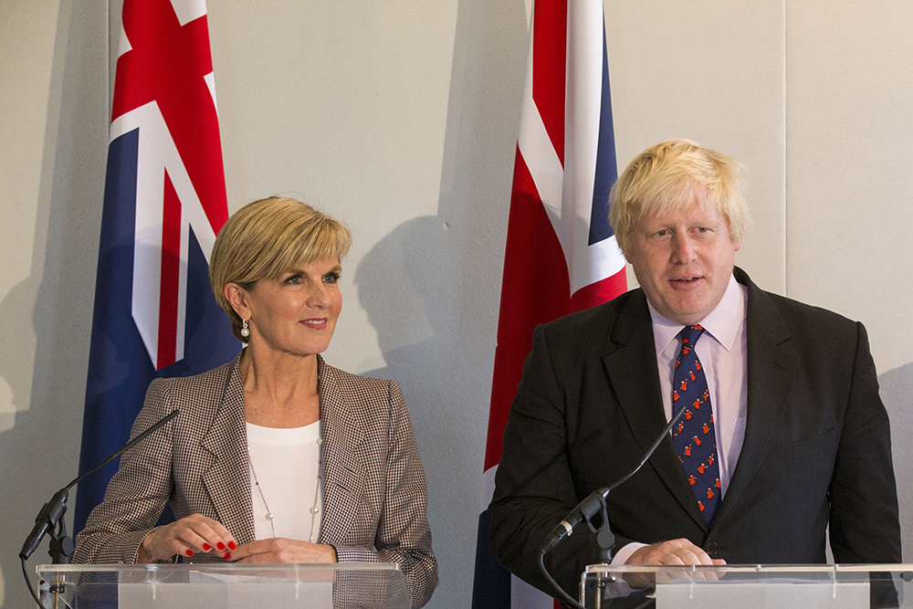 Foreign Minister Julie Bishop with UK Foreign Secretary Boris Johnson at the AUKMIN joint press conference at Royal Hospital Chelsea. Photo credit: Jim Ross