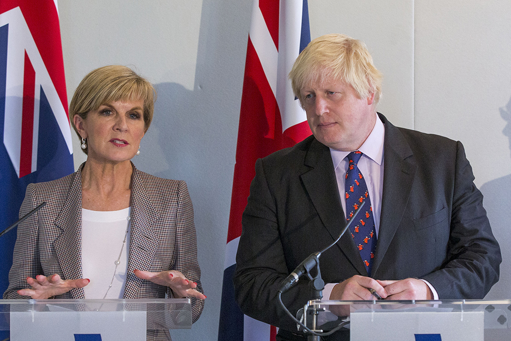 Foreign Minister Julie Bishop with UK Foreign Secretary Boris Johnson at the AUKMIN joint press conference at Royal Hospital Chelsea. Photo credit: Jim Ross