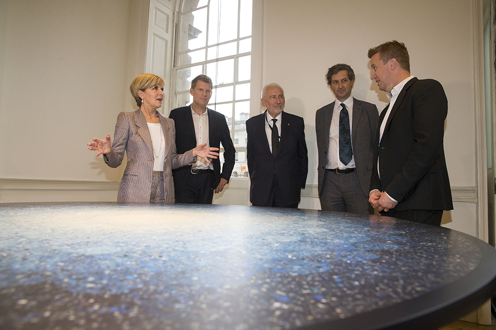 Foreign Minister Julie Bishop talks with Sir John Sorrell (President, London Design Biennale), Christopher Turner (Director, London Design Biennale), Jonathan Reekie (Director, Somerset House Trust) ahead of touring the Australian Pavilion at the London Design Biennale. Photo credit: Jim Ross