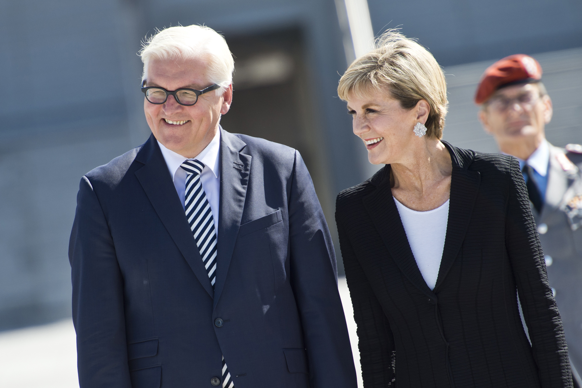 Foreign Minister Julie Bishop with the German Foreign Minister, Mr Frank Walter Steinmeier, at the official military welcome ceremony for the 2+2 consultations in Berlin, 6 Sept.