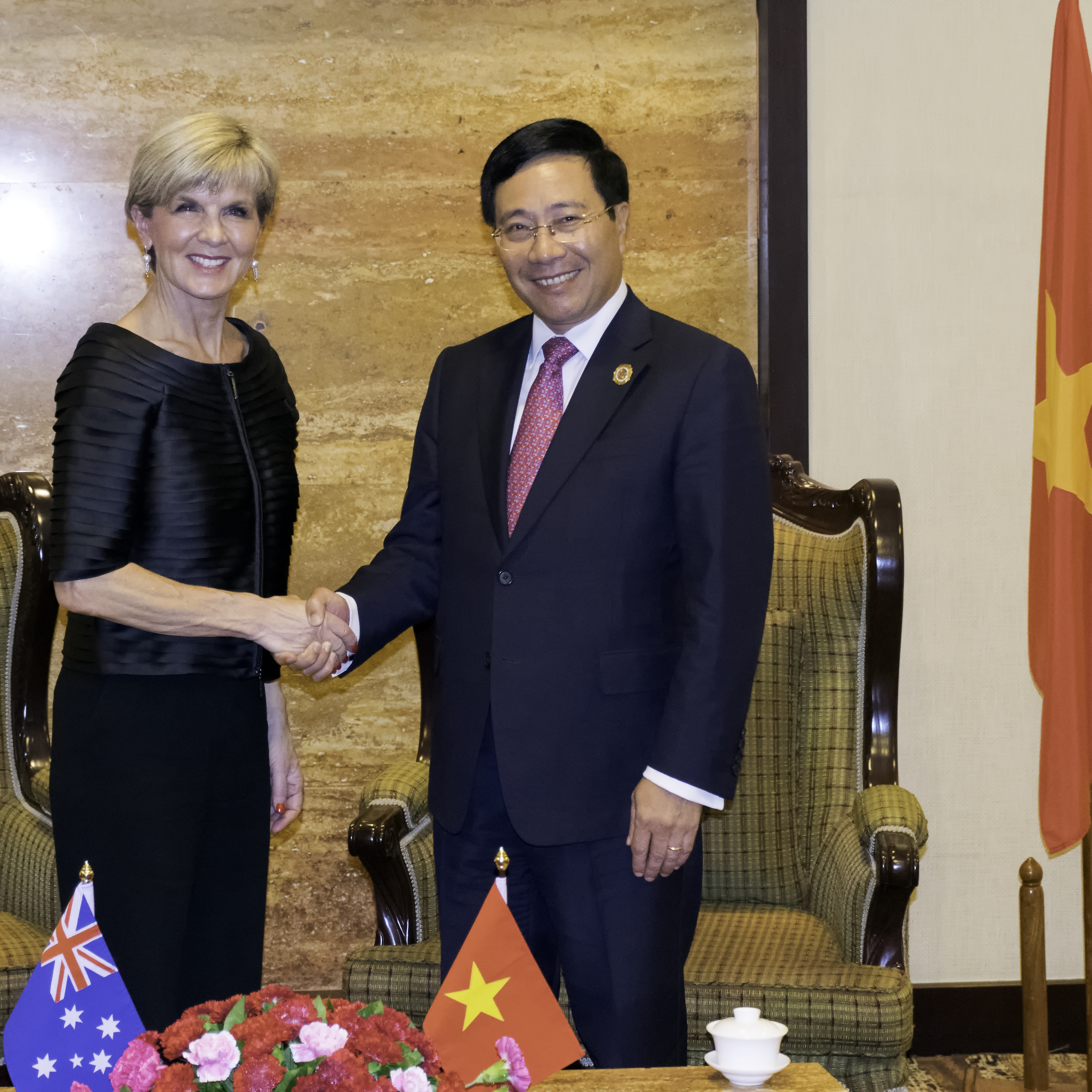 Australian Foreign Minister Julie Bishop meets HE Mr Pham Binh Minh, Deputy Prime Minister and Minister of Foreign Affairs of Vietnam, during the 2016 ASEAN Ministerial Meetings in Vientiane, Laos. 24 July 2016. Photo credit: DFAT