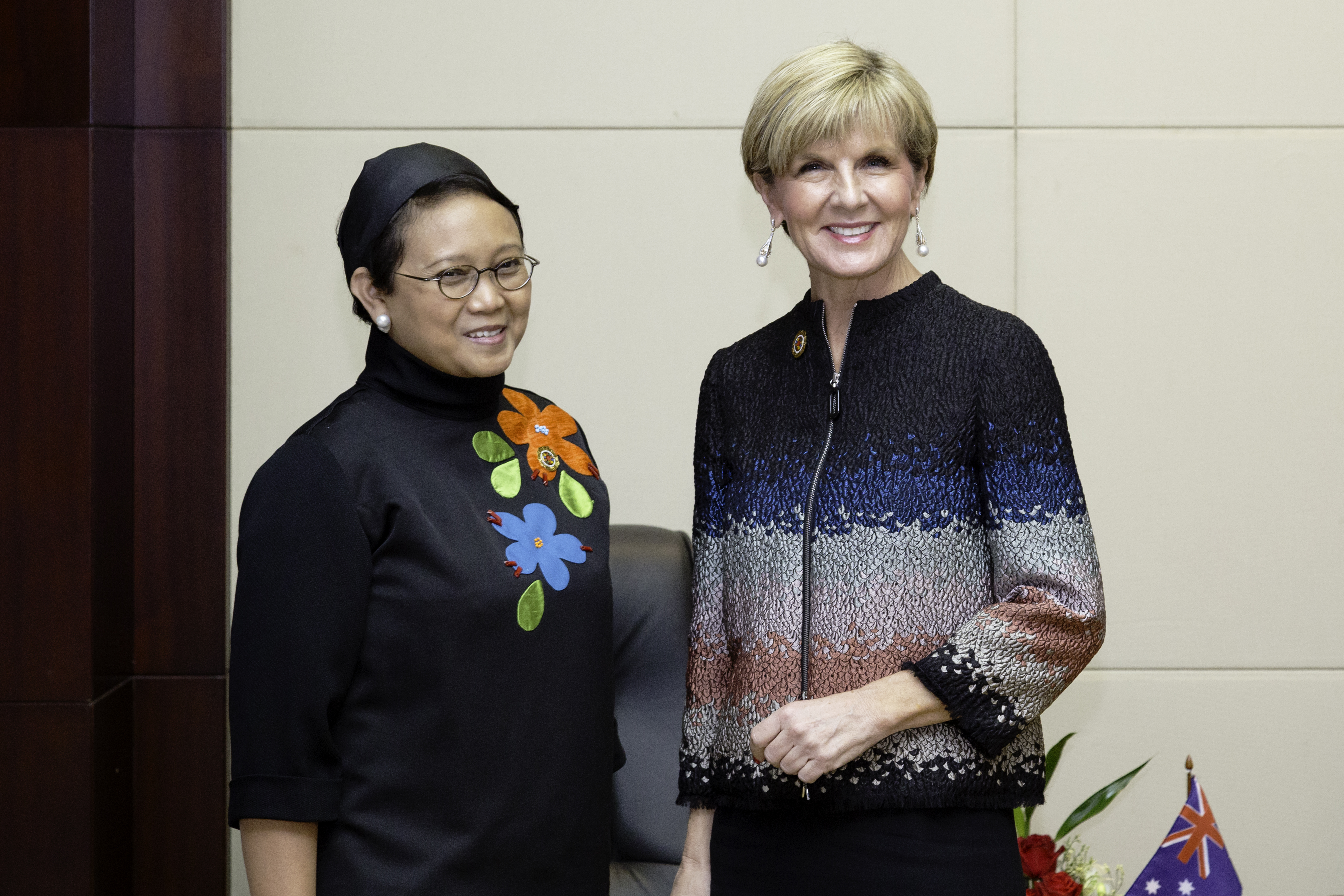 Australian Foreign Minister Julie Bishop meets HE Ms Retno Marsudi, Minister of Foreign Affairs of Indonesia, during the 2016 ASEAN Ministerial Meetings in Vientiane, Laos. 25 July 2016. Photo credit: DFAT/Bart Verweij