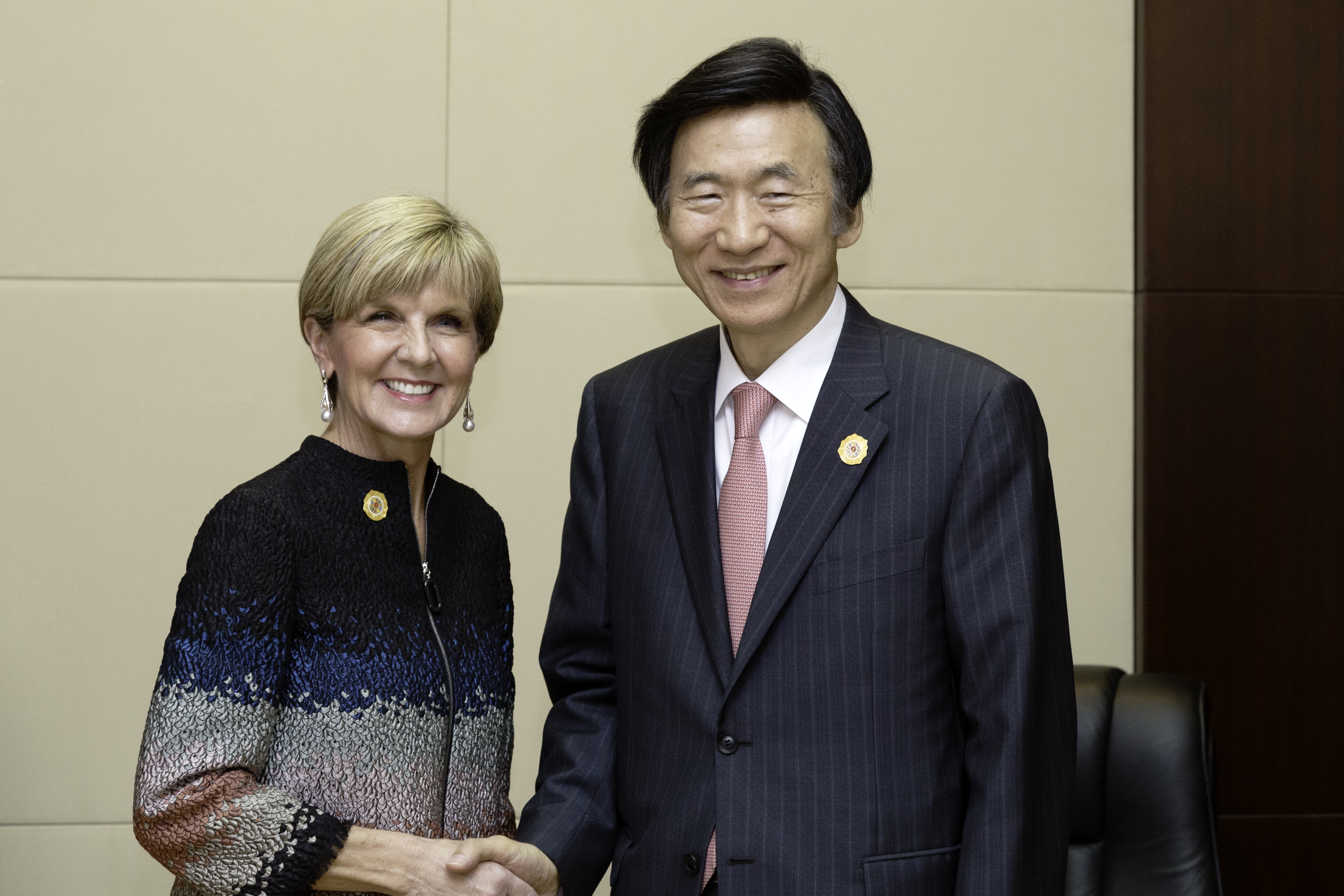 Australian Foreign Minister Julie Bishop meets HE Mr Yun Byung-se, Minister of Foreign Affairs of the Republic of Korea, ahead of the 6th East Asia Summit Foreign Ministers’ Meeting in Vientiane, Laos. 25 July 2016. Photo credit: DFAT/Bart Verweij