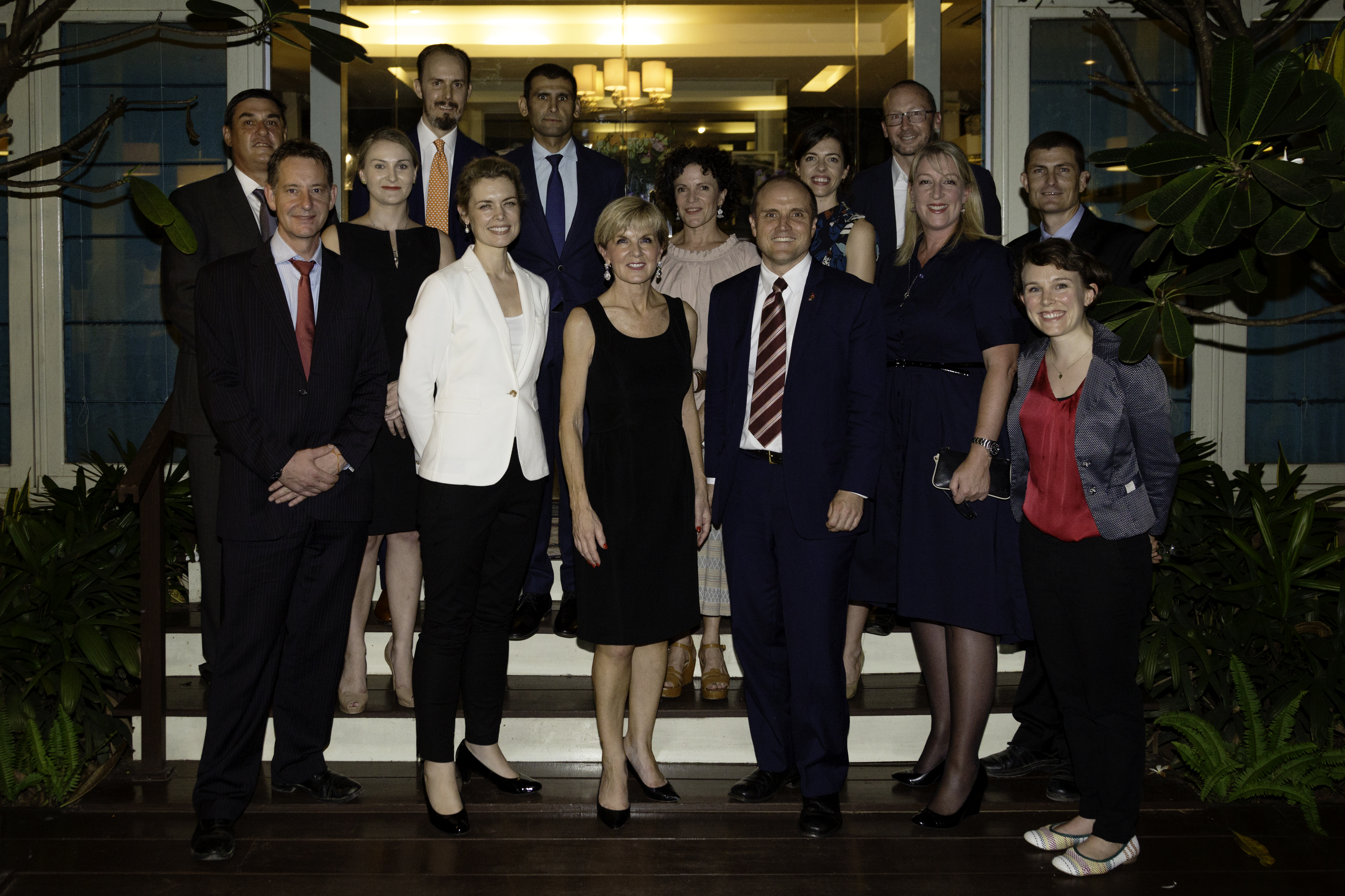 Foreign Minister Julie Bishop and Ambassador to Laos HE John Williams (centre right) with Australian business leaders in Vientiane, Laos. 26 July 2016. Photo credit: DFAT/Bart Verweij