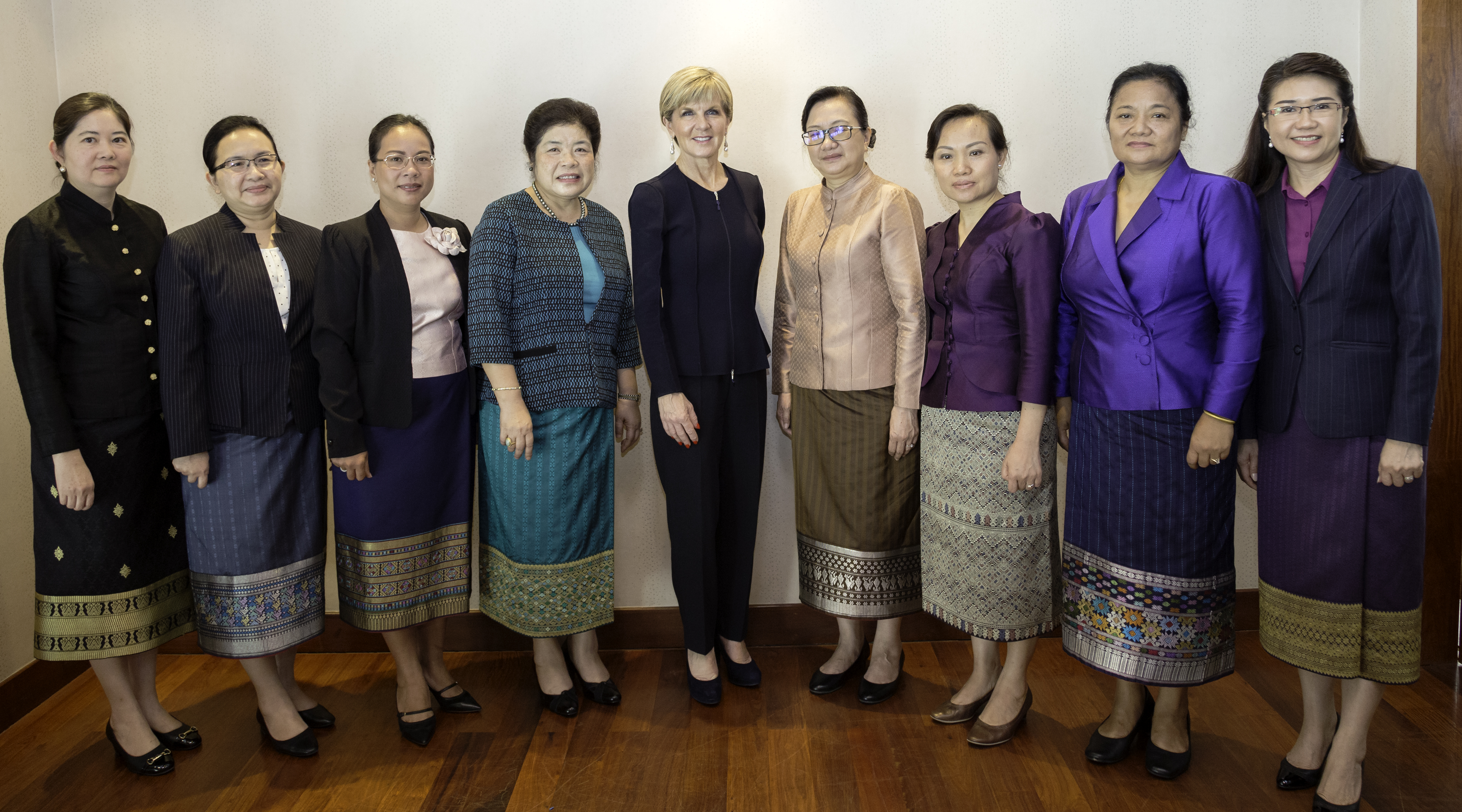 Foreign Minister Julie Bishop meets Lao women leaders in Vientiane, Laos. (L-R) Mme Vathana Dalaloy, Vice Governor of the Bank of Lao, Mme Thipphakone Chanthavongsa, Vice Minister for Finance, Mme Bounkham Vorachit, Vice Minister for Natural Resources and Environment, Dr Souvanpheng Bouphanouvong, Minister to the Prime Minister’s Office, Mme Khemmani Pholsena, Minister for Industry and Commerce, Mme Baykham Khattiya, Vice Minister of Labour and Social Welfare, Mme Bundith Prathomvanh, Vice President of Lao Women’s Union, Mme Valy Vetsaphong, Vice President of Lao National Chamber of Commerce and Industry. 27 July 2016. Photo credit: DFAT/Bart Verweij
