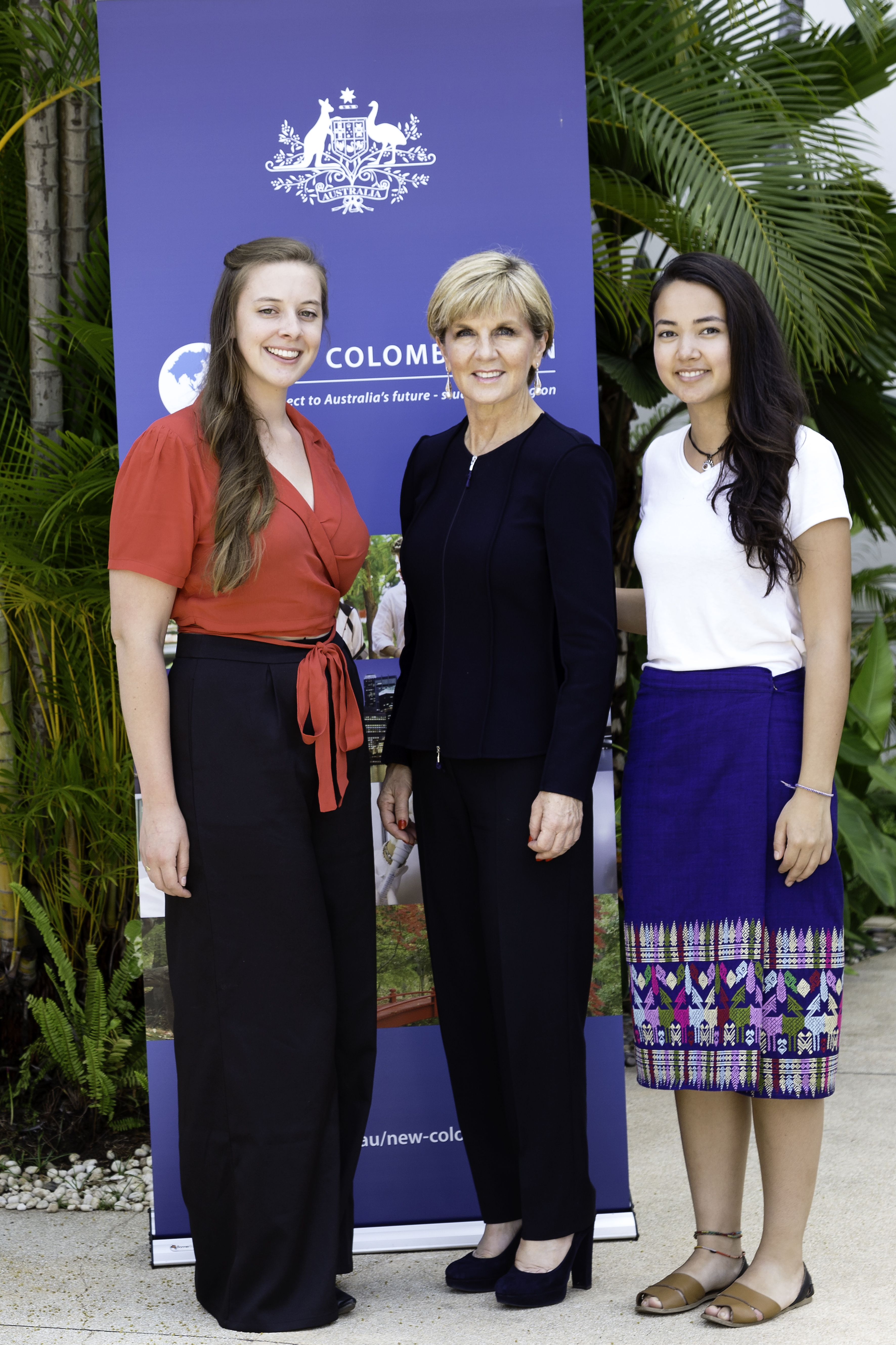 Australian Foreign Minister Julie Bishop meets with New Colombo Plan scholar Caitlin McQuarie (left) and Australian PhD student Luisa Olmo (right) in Vientiane, Laos. 27 July 2016. Photo credit: DFAT/Bart Verweij