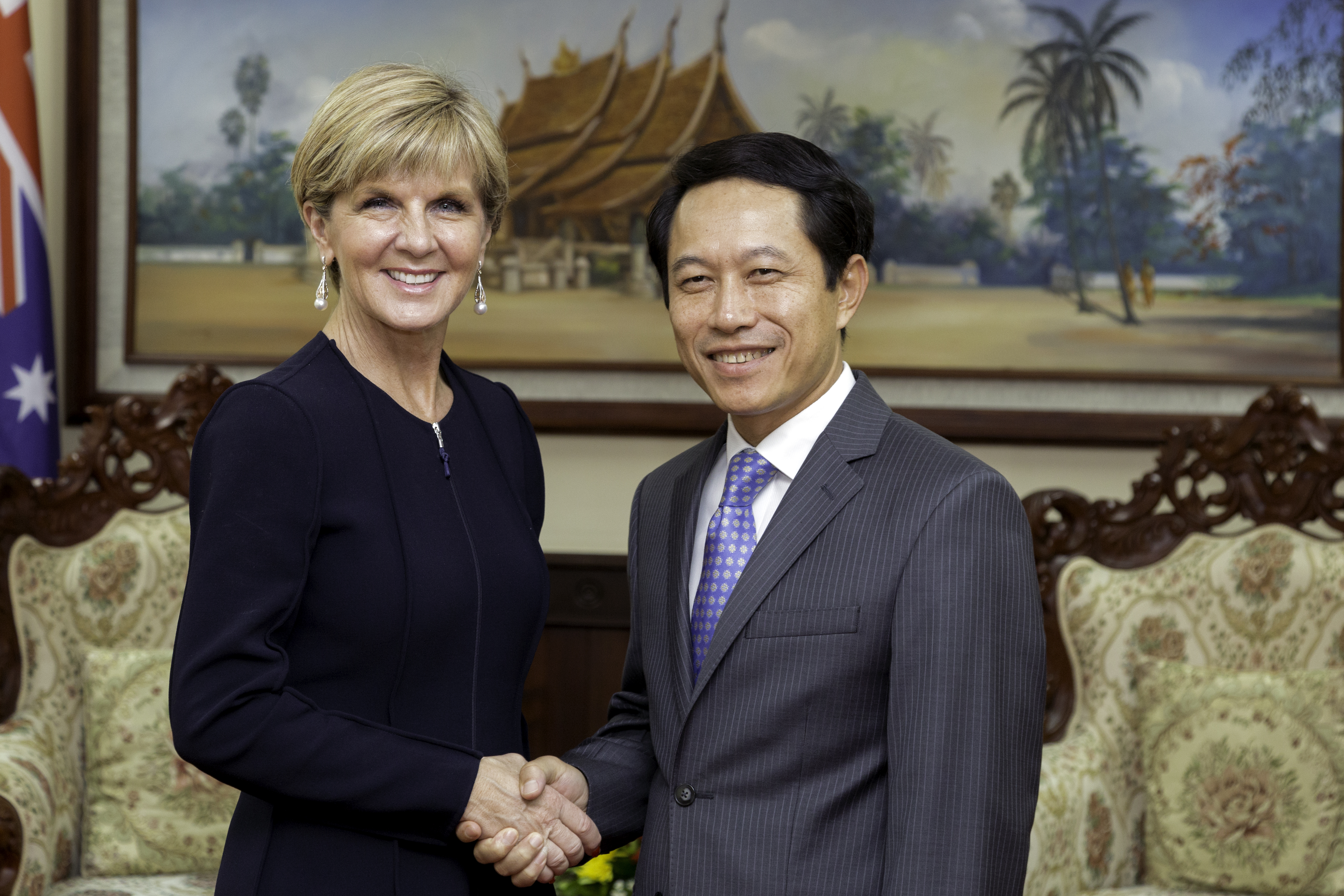Foreign Minister Julie Bishop with Lao Foreign Minister and Monash University alumnus HE Mr Saleumxay Kommasith in Vientiane, Laos. 27 July 2016. Photo credit: DFAT/Bart Verweij