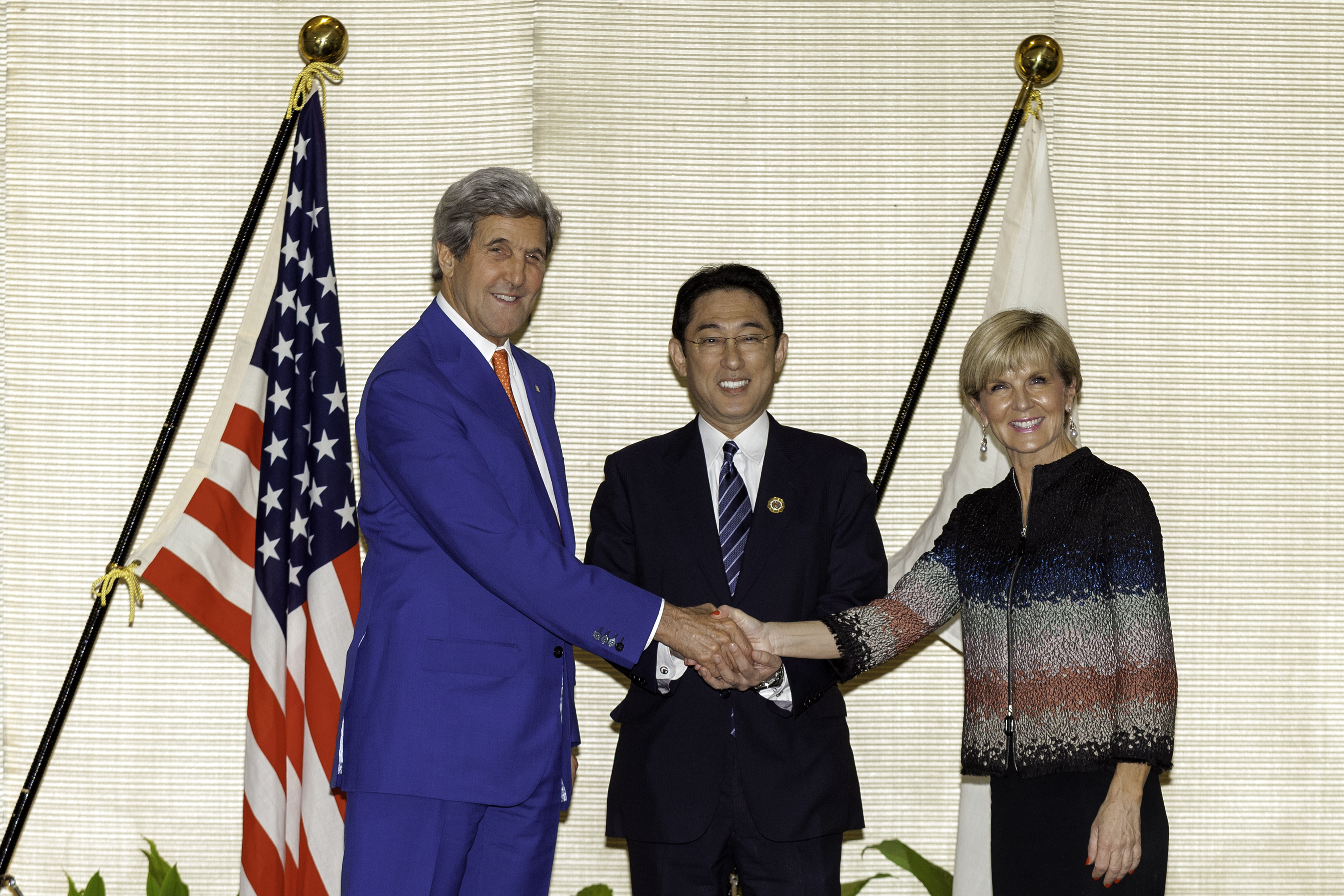 Australian Foreign Minister Julie Bishop meets US Secretary of State John Kerry and Japanese Minister of Foreign Affairs Fumio Kishida for the 6th Ministerial Meeting of the Trilateral Strategic Dialogue in Vientiane, Laos. 25 July 2016. Photo credit: DFAT/Bart Verweij