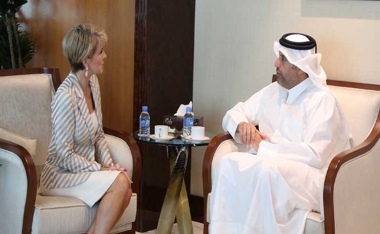 Foreign Minister Julie Bishop talks with Minister of Economy and Commerce H.E. Sheikh Ahmed bin Jassim Al-Thani during her visit to Doha, Qatar. Credit: Qatar News Agency.