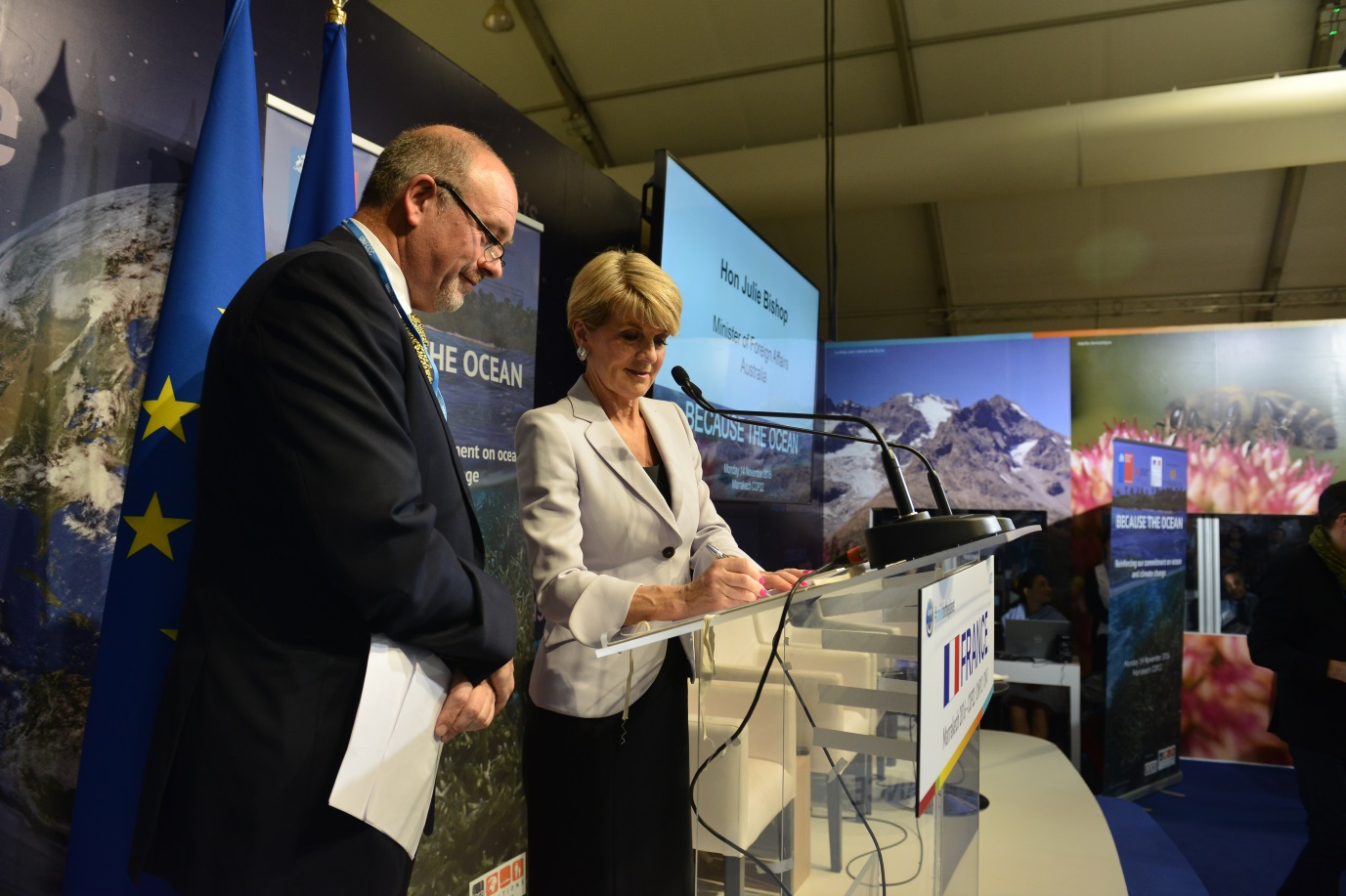 Minister Bishop signs the “Because the Ocean” declaration at COP22 in Marrakech on 14 November 2016. Credit: DFAT/Khalid Maltoufi.