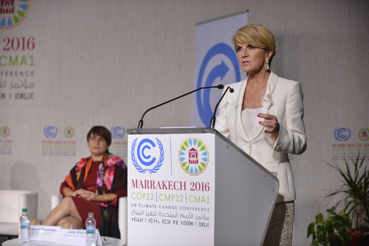 Minister Bishop delivers remarks at the UNFCCC Momentum for Change: Women for Results event at COP22 in Marrakech on 15 November 2016. Credit: DFAT/Khalid Maltoufi.