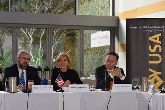 Foreign Minister Julie Bishop with (L) Professor Gordon Flake, CEO, Perth US Asia Centre and (R) Professor Simon Jackman, CEO, US Studies Centre, University of Sydney addressing the US-Australian Dialogue on Cooperation in the Indo-Pacific roundtable in Los Angeles on 26 January 2017.