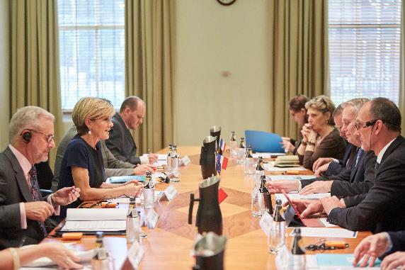 Foreign Minister Julie Bishop and French Foreign Minister HE Jean-Marc Ayrault commence bilateral talks in Melbourne, 3 March 2017. Photo credit: DFAT/ Kristian Gehradte
