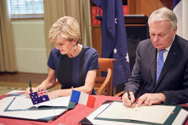 Foreign Minister Julie Bishop and French Foreign Minister HE Jean-Marc Ayrault sign a Joint Statement of Enhanced Strategic Partnership between Australia and France, following bilateral discussions in Melbourne, 3 March 2017. Photo credit: DFAT/ Kristian Gehradte