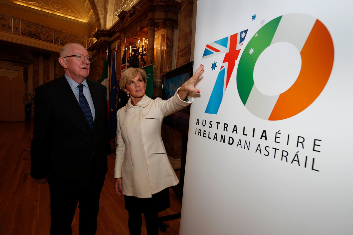 Foreign Minister Julie Bishop and Irish Minister for Foreign Affairs and Trade Charlie Flanagan view a logo marking the 70th anniversary of diplomatic relations between their two countries. Photo credit: Commonwealth of Australia