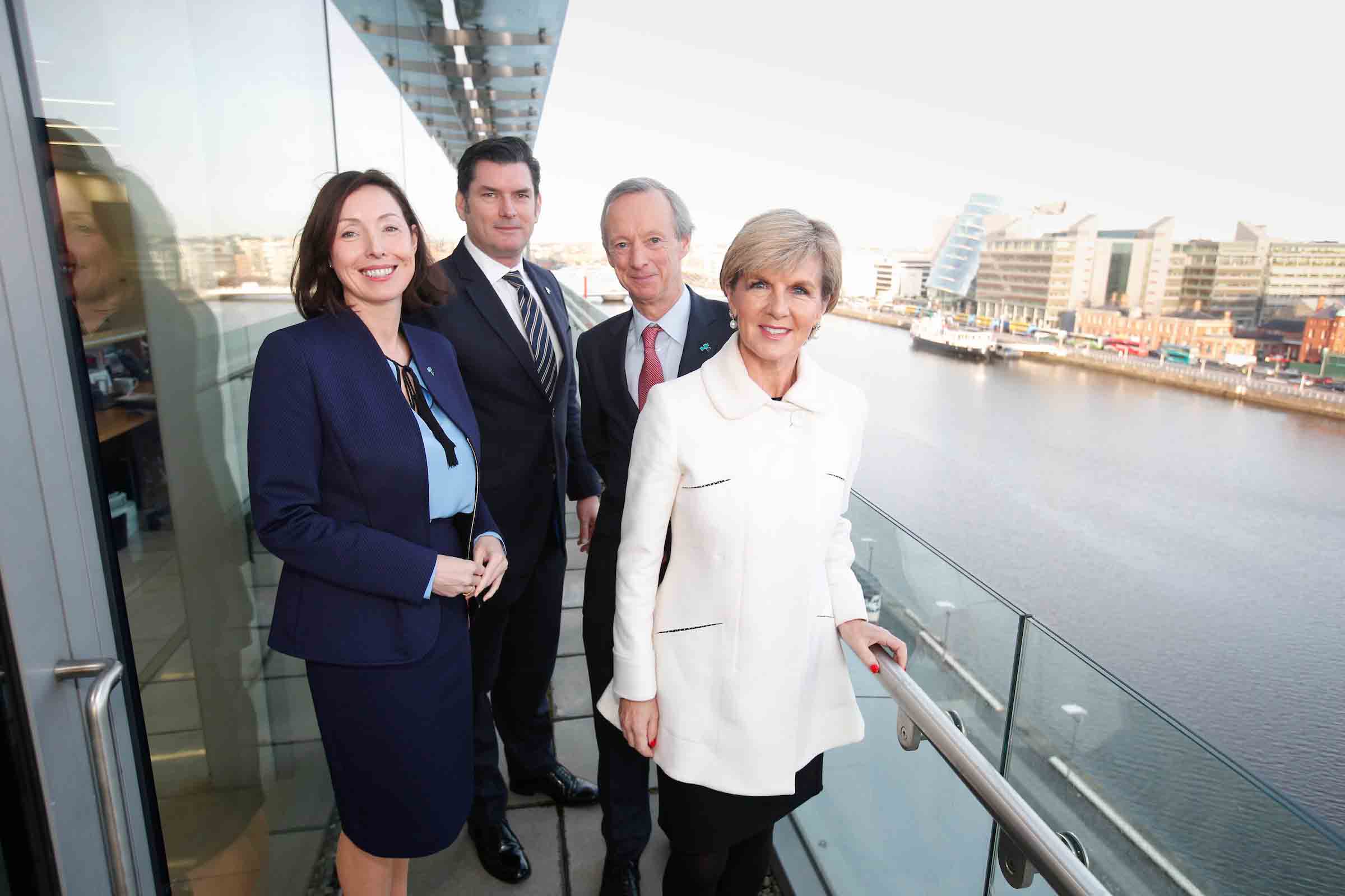 Foreign Minister Julie Bishop at the Irish Australia Chamber of Commerce breakfast in Dublin. She was welcomed by Helen Kelly, Partner and head of the EU, Competition and Regulatory Law Group at Mathesons, the President of the Irish Chapter of the Irish Australian Chamber of Commerce Peter Oakes and the Vice President Vincent Crowley. Photo credit: Commonwealth of Australia