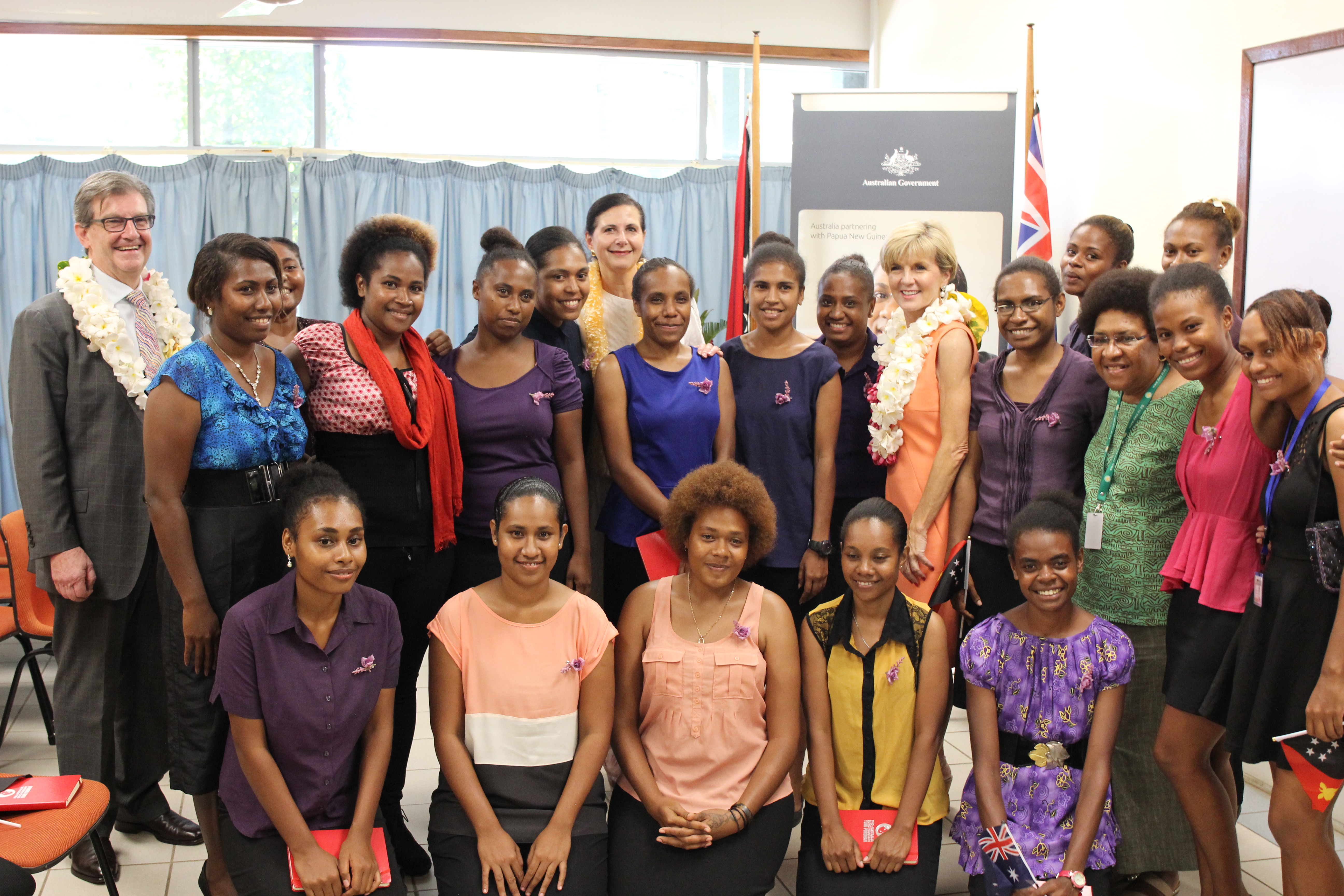 Minister for Foreign Affairs Julie Bishop, Minister for the Pacific and International Development, Concetta Fierravanti-Wells, Australian High Commissioner to Papua New Guinea, Bruce Davis and Divine Word University, Dr Cecila Nembou with female students from Divine Word University in Madang. Minister Bishop and Minister Fierravanti-Wells spoke to female students as part of the university’s International Women’s Day celebrations. Photo credit: DFAT/Aaron English