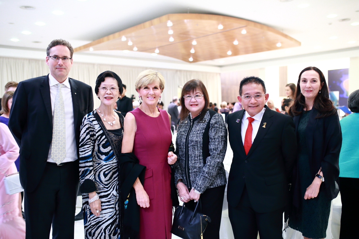 Foreign Minister Julie Bishop with Australian High Commissioner to Malaysia, HE Rod Smith, Puan Seri Christine Khir Johari, Malaysian Deputy Minister of Higher Education, Datuk Mary Yap Kain Ching, Member of Parliament for Kuala Selangor, YB Dato Sri Dr Irmohizam Ibrahim and High Commissioner’s wife Leanne at International Women’s Day Dinner at the High Commission in Kuala Lumpur. 14 March 2017 / Zulaika Ibrahim