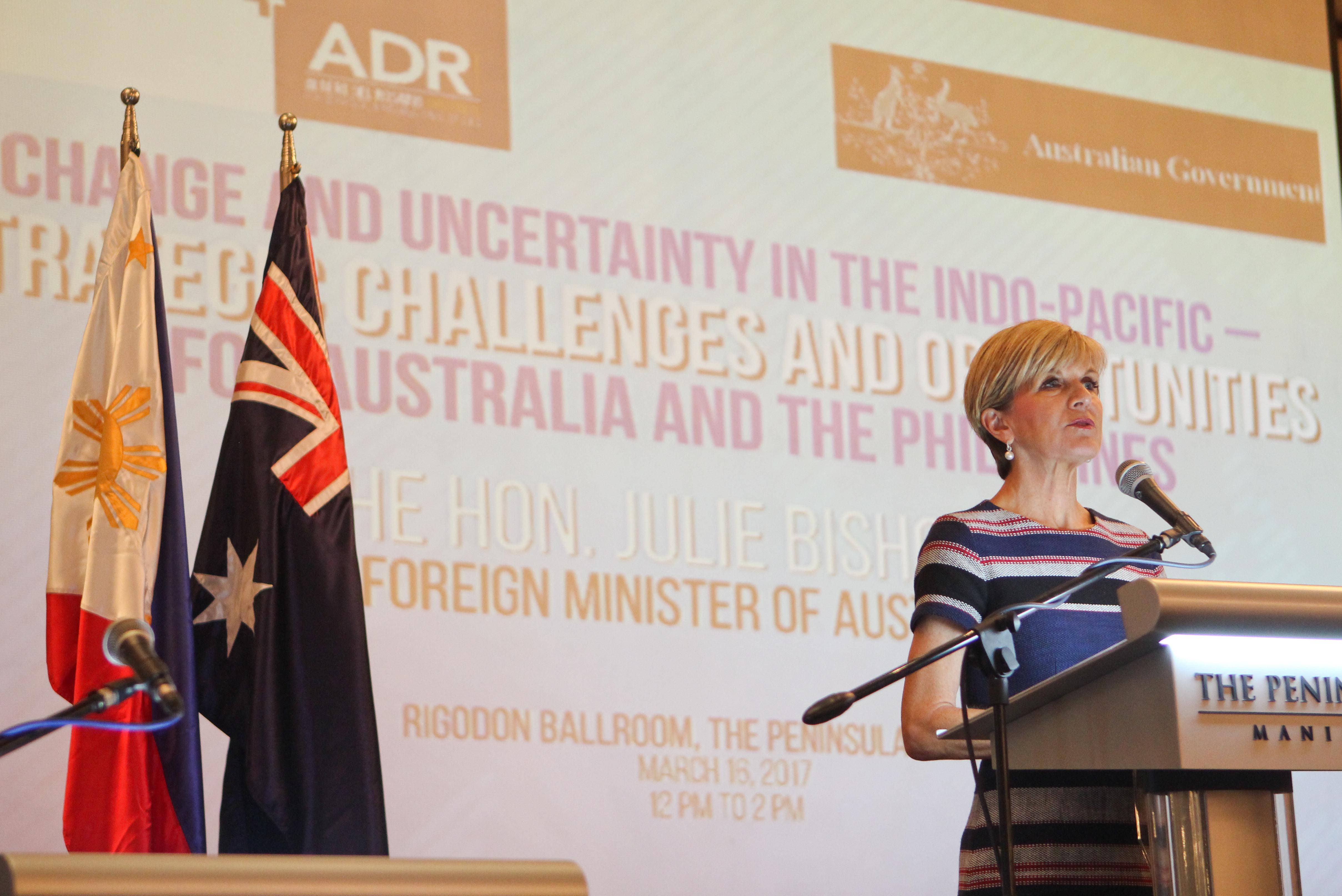 Foreign Minister Julie Bishop addresses Albert del Rosario Institute on “Change and Uncertainty in the Indo-Pacific – Strategic challenges and opportunities for Australia and the Philippines” in Manila, 16 March 2017. Photo credit: DFAT/Stephanie Tumampos