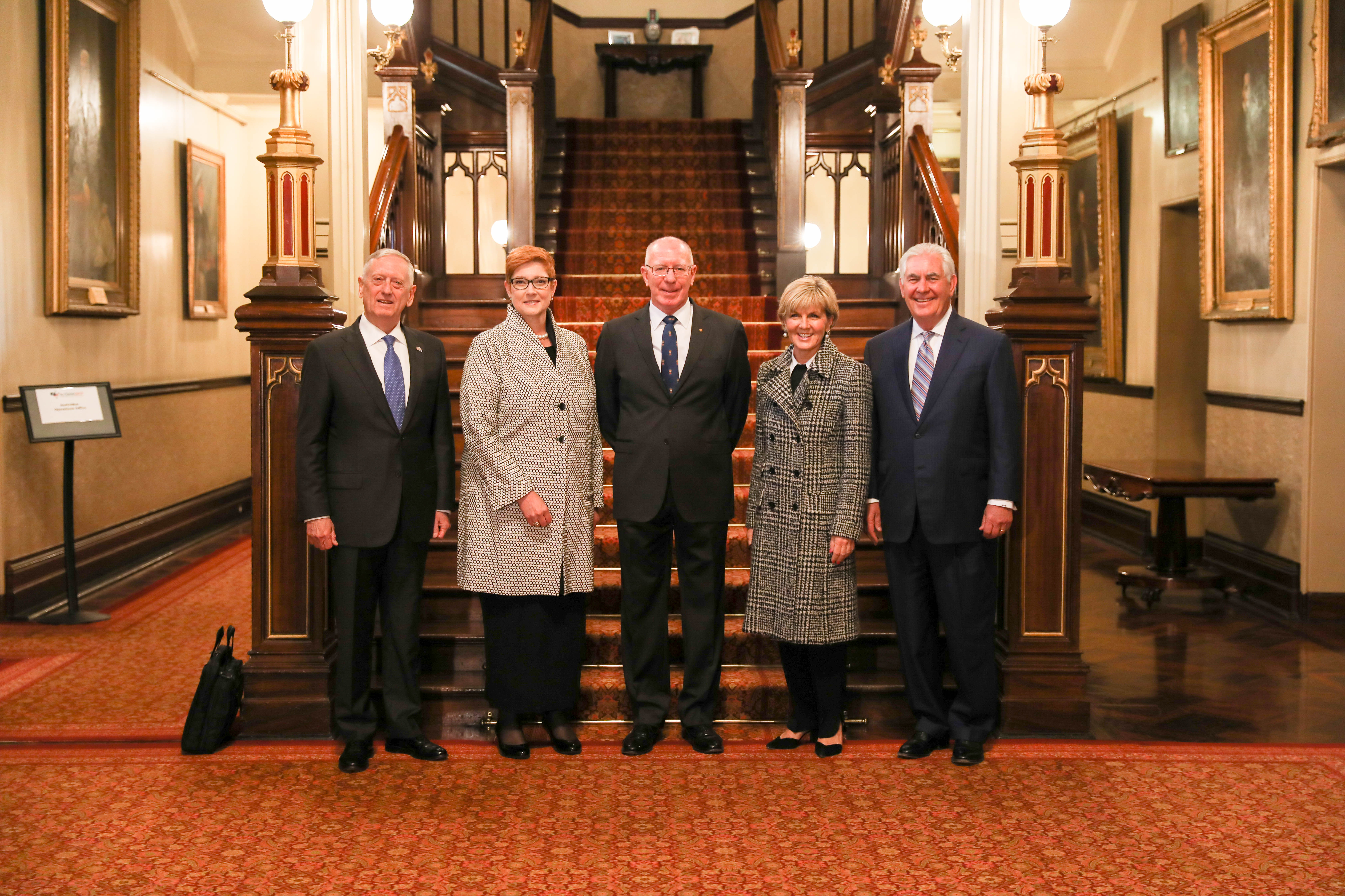 NSW Governor David Hurley welcomes Foreign Minister Julie Bishop, US Secretary of State Rex Tillerson, US Secretary of Defense James Mattis and Defence Minister Marise Payne to Government House in Sydney for AUSMIN on 5 June 2017.