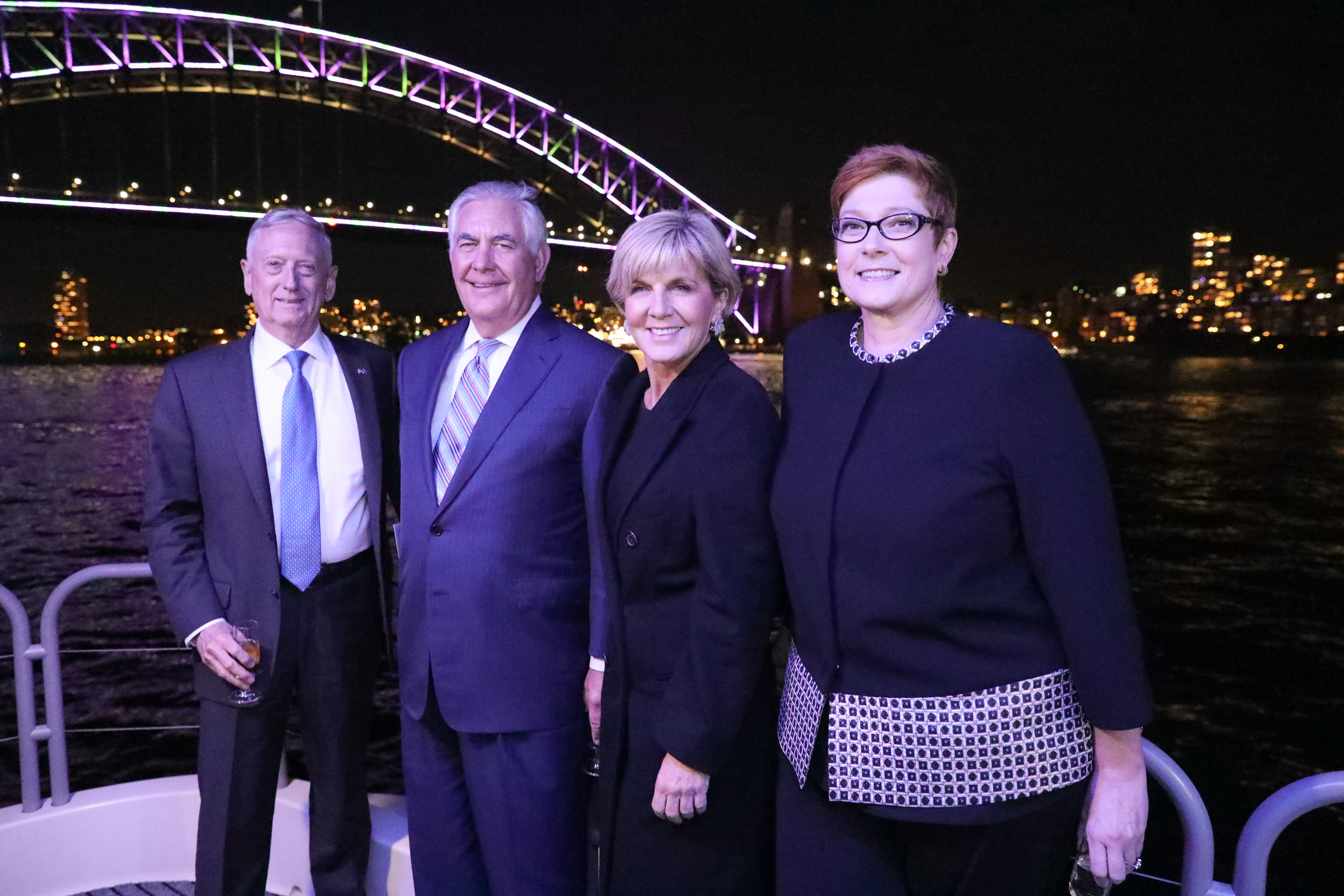Foreign Minister Julie Bishop and Defence Minister Marise Payne show Sydney Harbour to US Secretary of Defense James Mattis and US Secretary of State Rex Tillerson following AUSMIN on 5 June 2017.