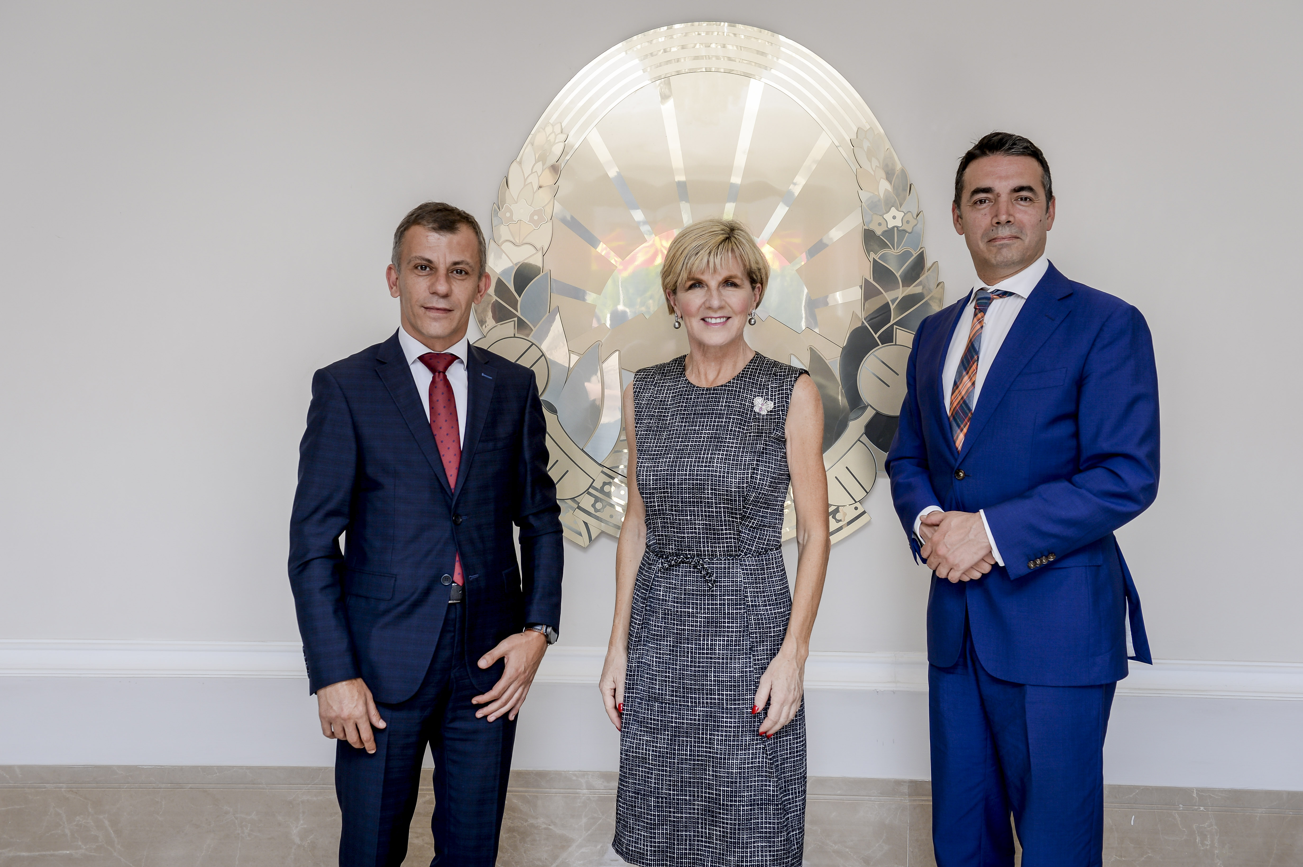 Foreign Minister Julie Bishop and Minister without portfolio in charge of Diaspora Edmond Ademi meet in Skopje, 11 July 2017. Foreign Minister Nikola Dimitrov is also present.