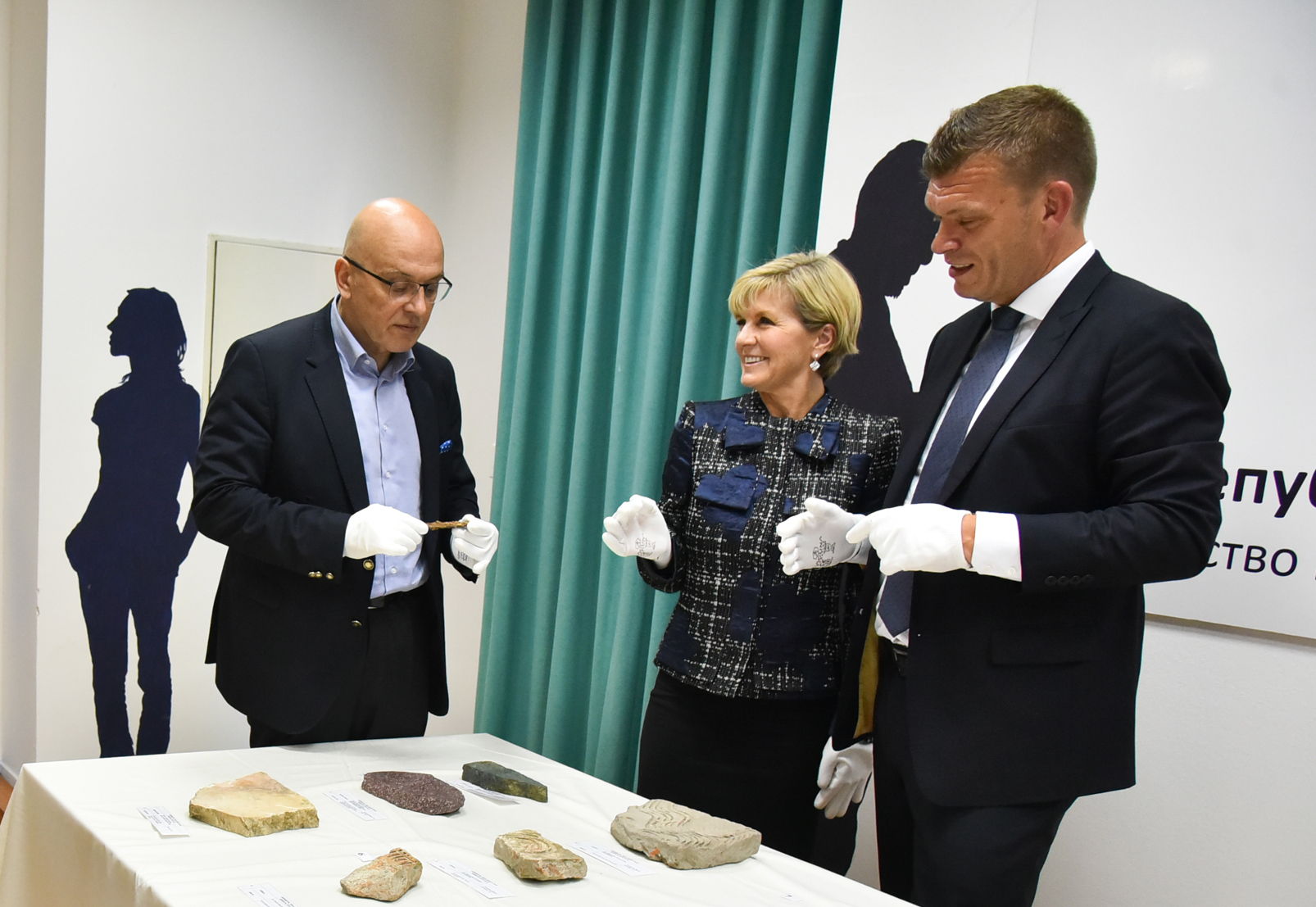 Foreign Minister Julie Bishop examines artefacts from the joint Australian/Serbian archaeological project in Glac, Serbia with Serbian Minister for Culture and Media Vladan Vukosavljevic and Sydney University Pro Vice Chancellor Richard Miles, 13 July 2017.