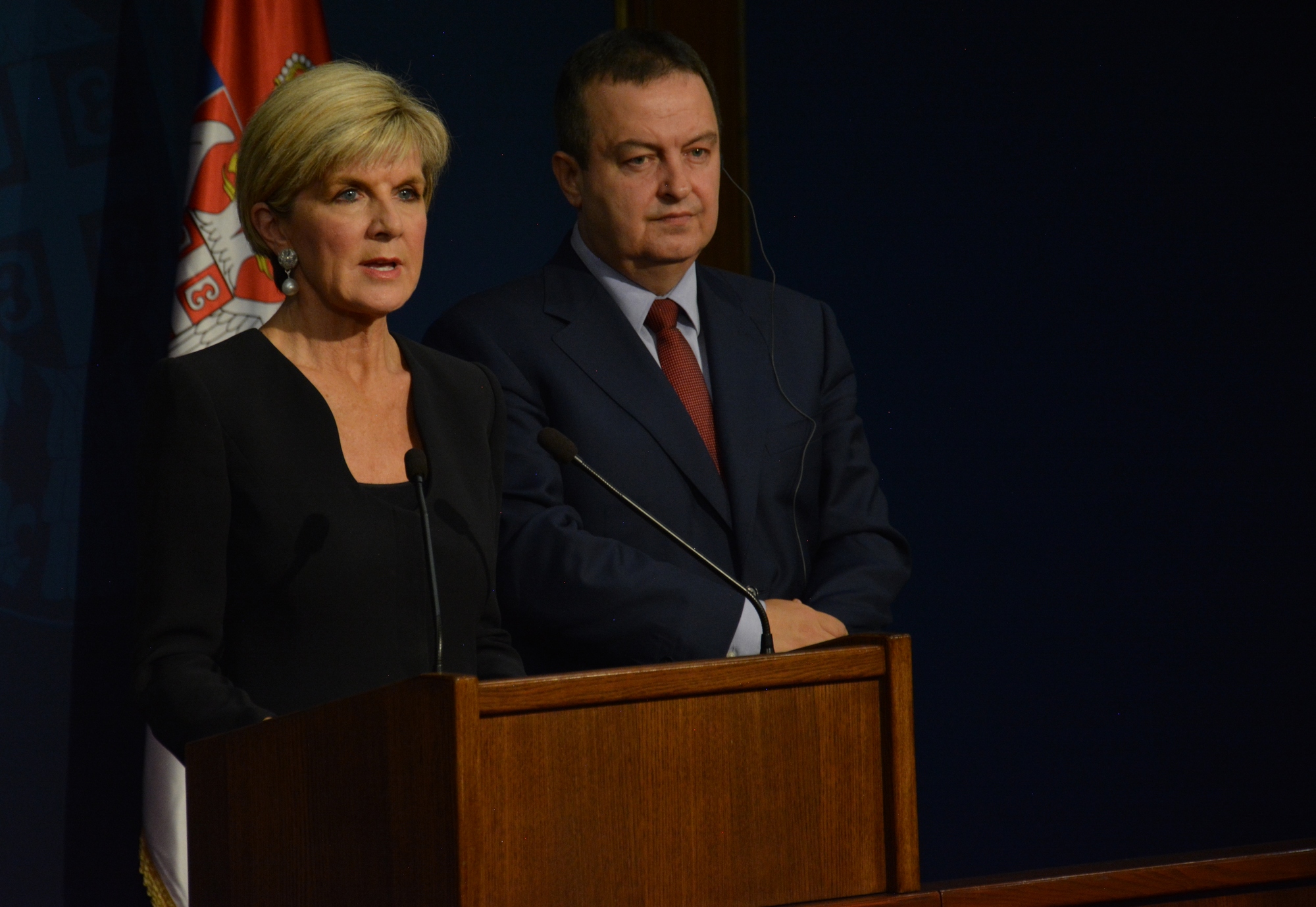 Foreign Minister Julie Bishop and Serbian Foreign Minister Ivica Dacic address the press in Belgrade, 14 July 2017.