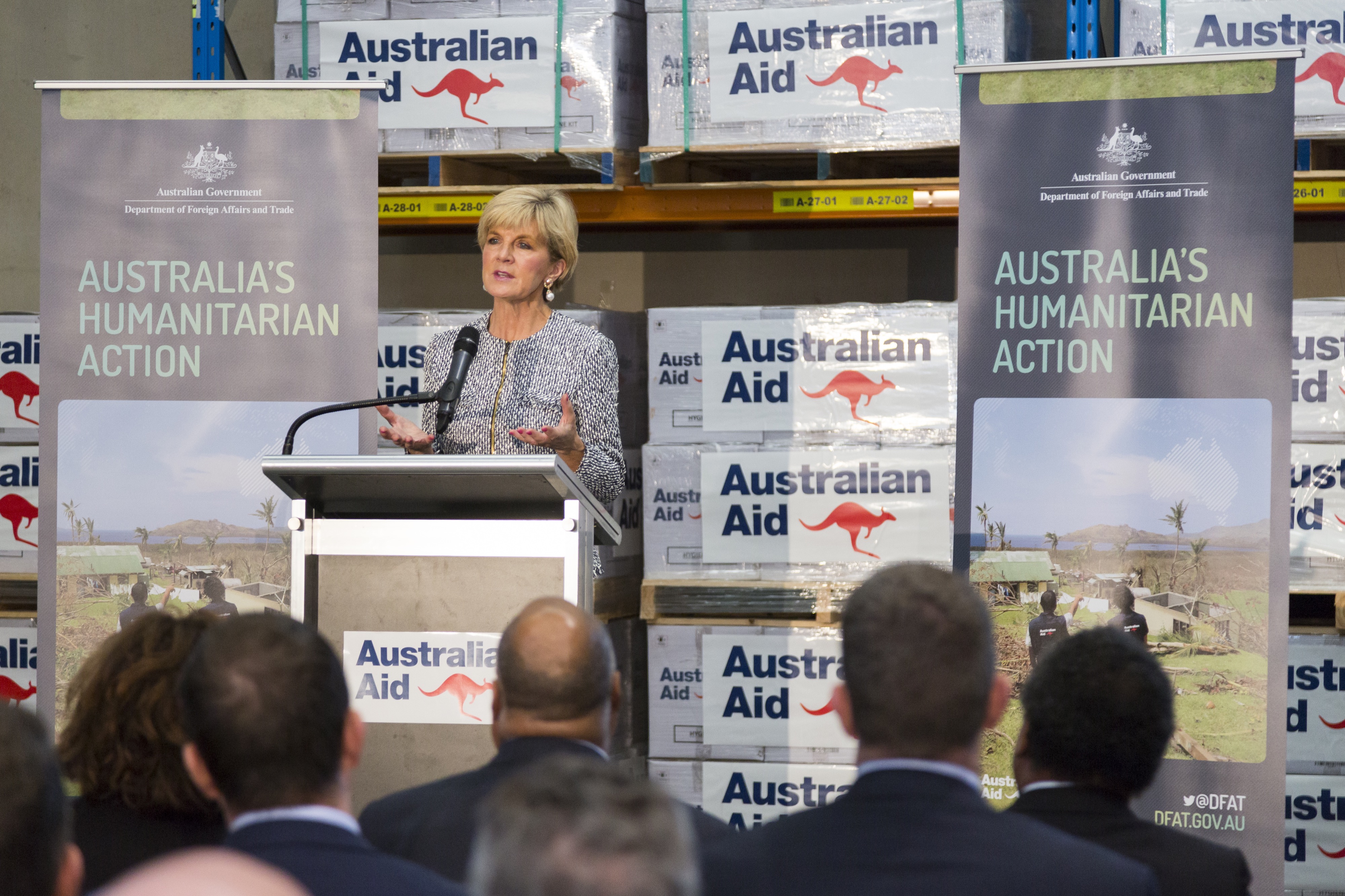 Foreign Minister Julie Bishop at the Australian Government’s humanitarian supplies warehouse in Brisbane to announce the new Australian Humanitarian Partnership and the winners of the Humanitarian Supply Challenge, 16 June 2017.