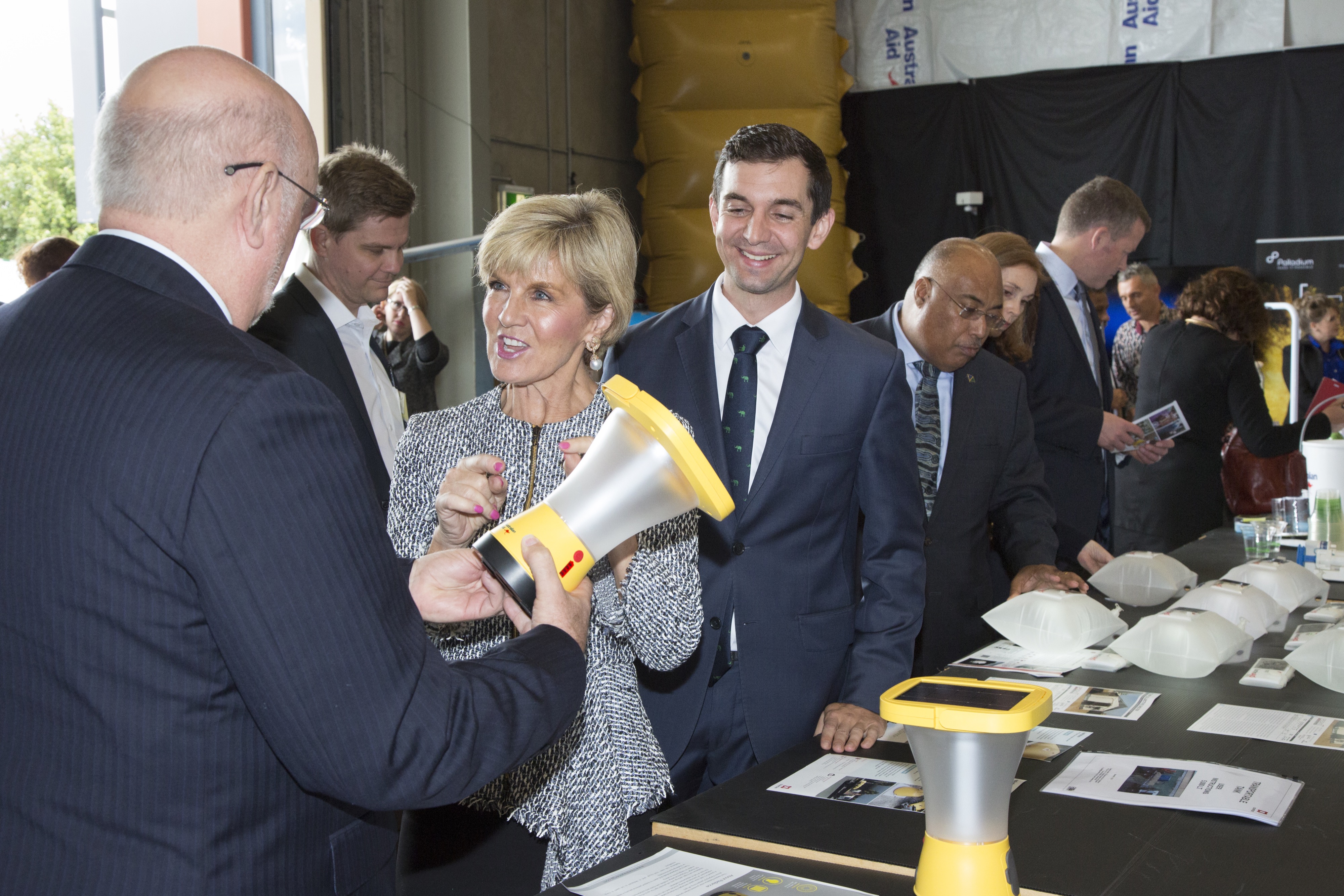 Foreign Minister Julie Bishop with Freeplay Energy’s John Hocknull (left) and Member for Brisbane Trevor Evans MP (right), discussing the Radiance Solar Lantern, a rechargeable solar light that can charge mobile phones or other electronic devices via USB, 16 June 2017.