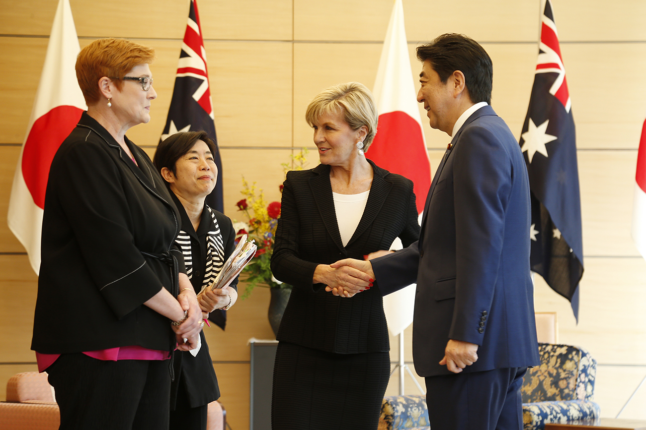 Foreign Minister Julie Bishop and Defence Minister Marise Payne meet with Japanese Prime Minister Shinzo Abe in Tokyo on 20 April 2017. Photo Credit: DFAT/Ken Shimizu