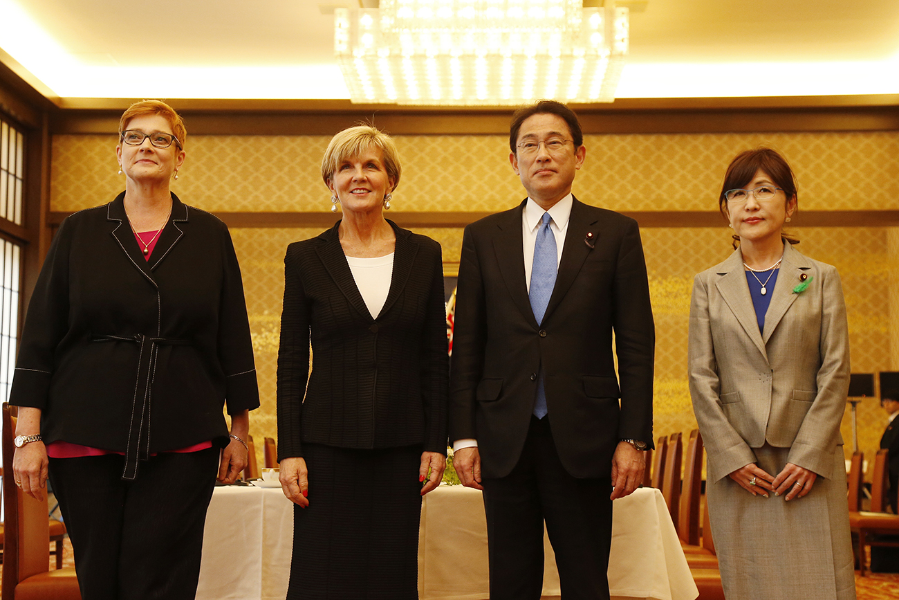 Defence Minister Marise Payne, Foreign Minister Julie Bishop, Foreign Minister Fumio Kishida and Defence Minister Tomomi Inada at the Australia-Japan Foreign and Defence Ministers' Meeting (2+2) in Tokyo on 20 April 2017. Photo Credit: DFAT/Ken Shimizu