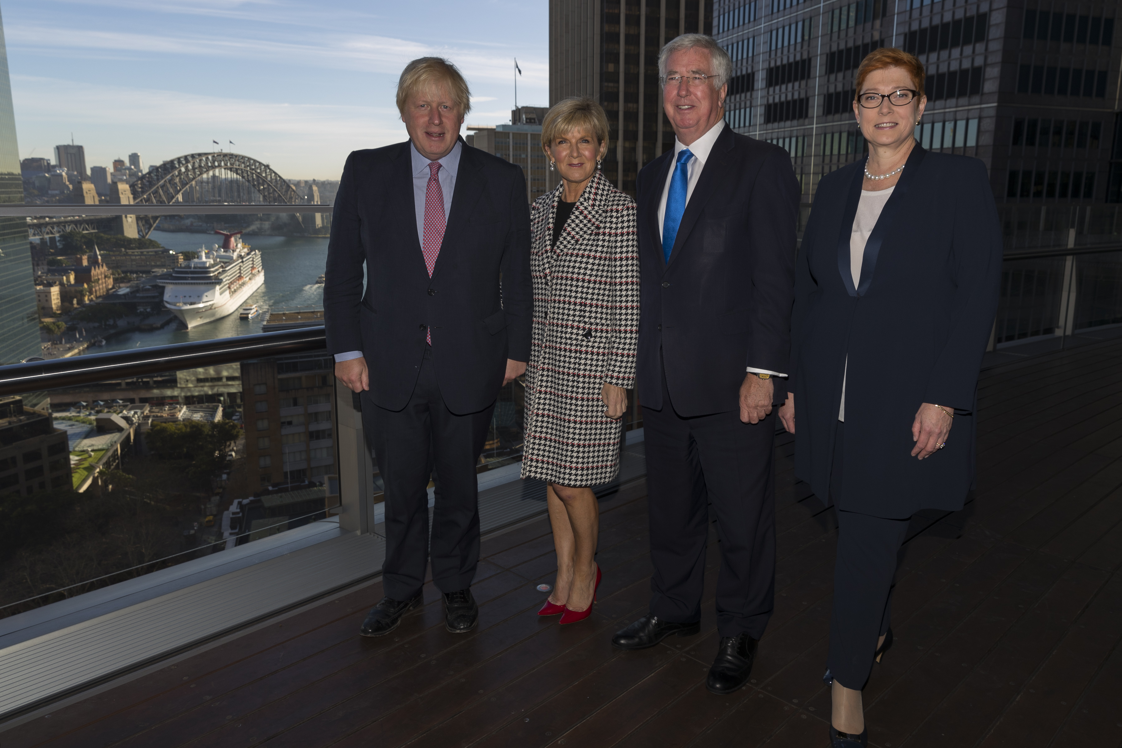 Foreign Minister Julie Bishop, UK Foreign Secretary Boris Johnson, Defence Minister Marise Payne, and UK Defence Secretary Sir Michael Fallon at the AUKMIN IX meeting in Sydney, 27 July 2017.