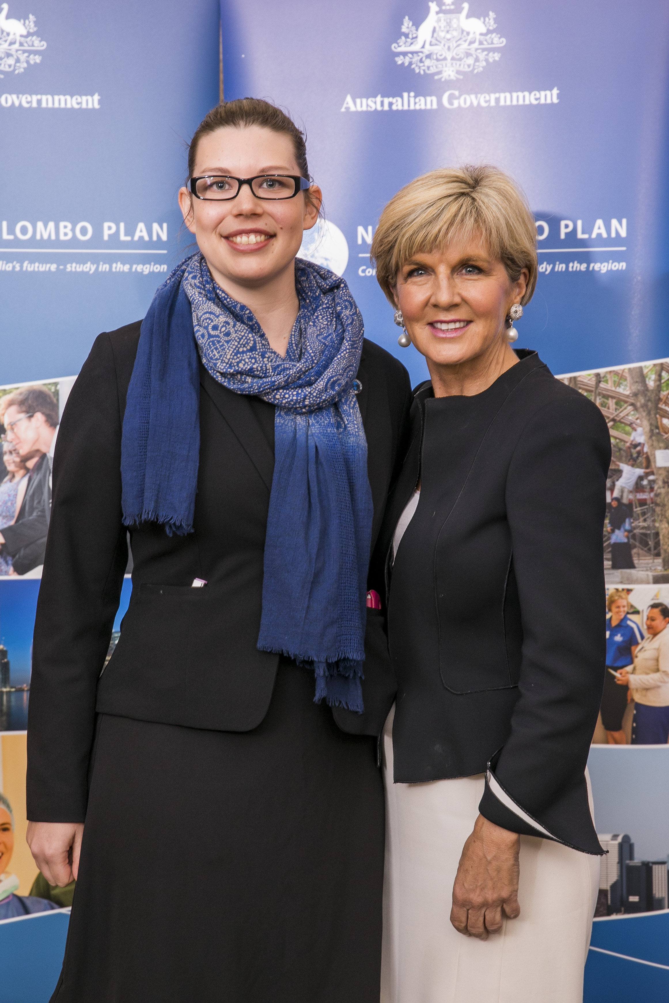 Minister for Foreign Affairs, the Hon Julie Bishop MP, with New Colombo Plan Alumni Ambassador Hannah Pratt in Perth, 25 August 2017.