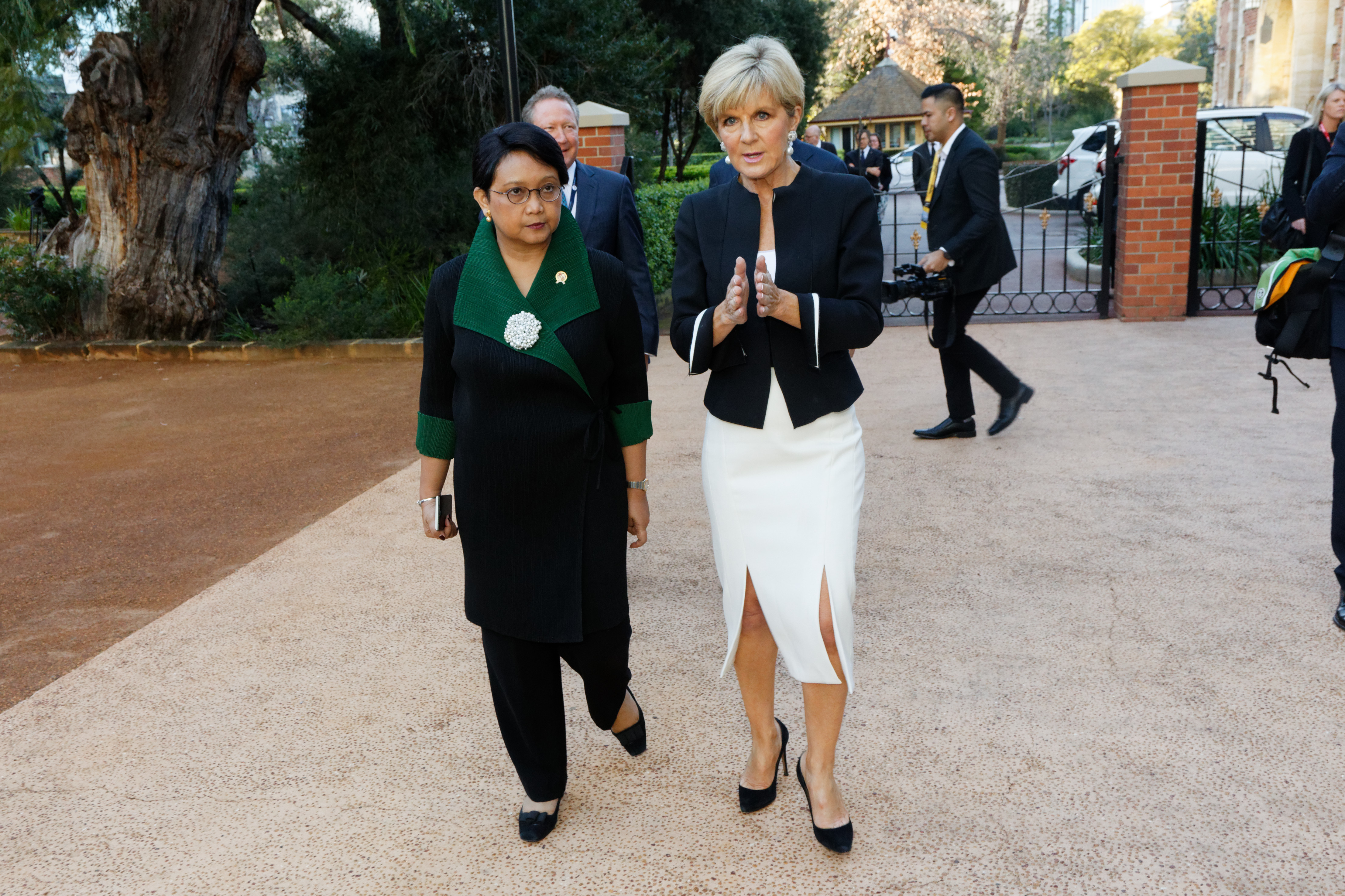 Foreign Minister Julie Bishop joins Indonesian Foreign Minister Retno Marsudi as they enter the Bali Process Government and Business Forum, 25 August 2017.