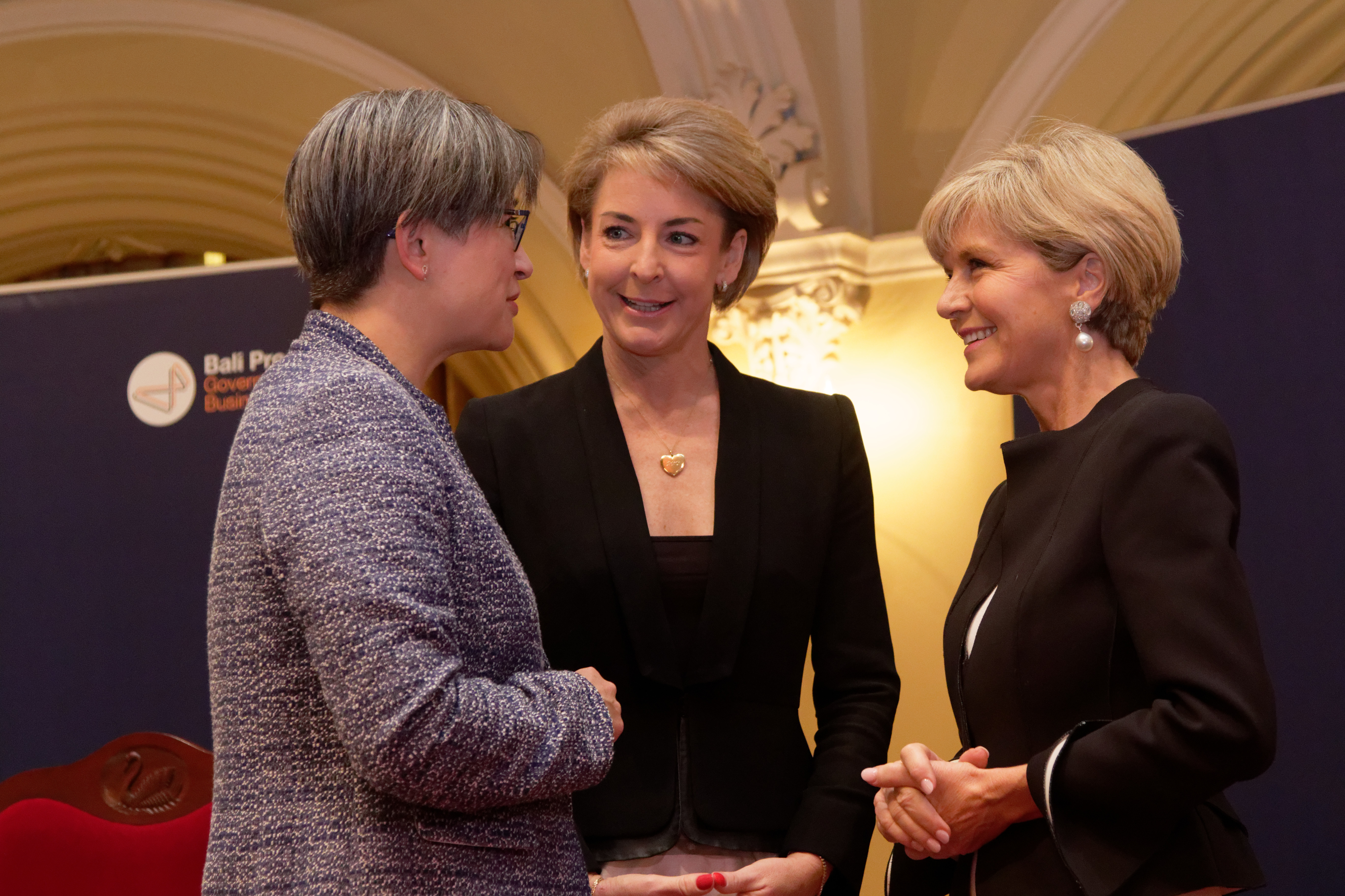 Foreign Minister Julie Bishop with Employment Minister Michaela Cash and Opposition Foreign Affairs spokeswoman Penny Wong at the Bali Process Government and Business Forum in Perth, 25 August 2017.