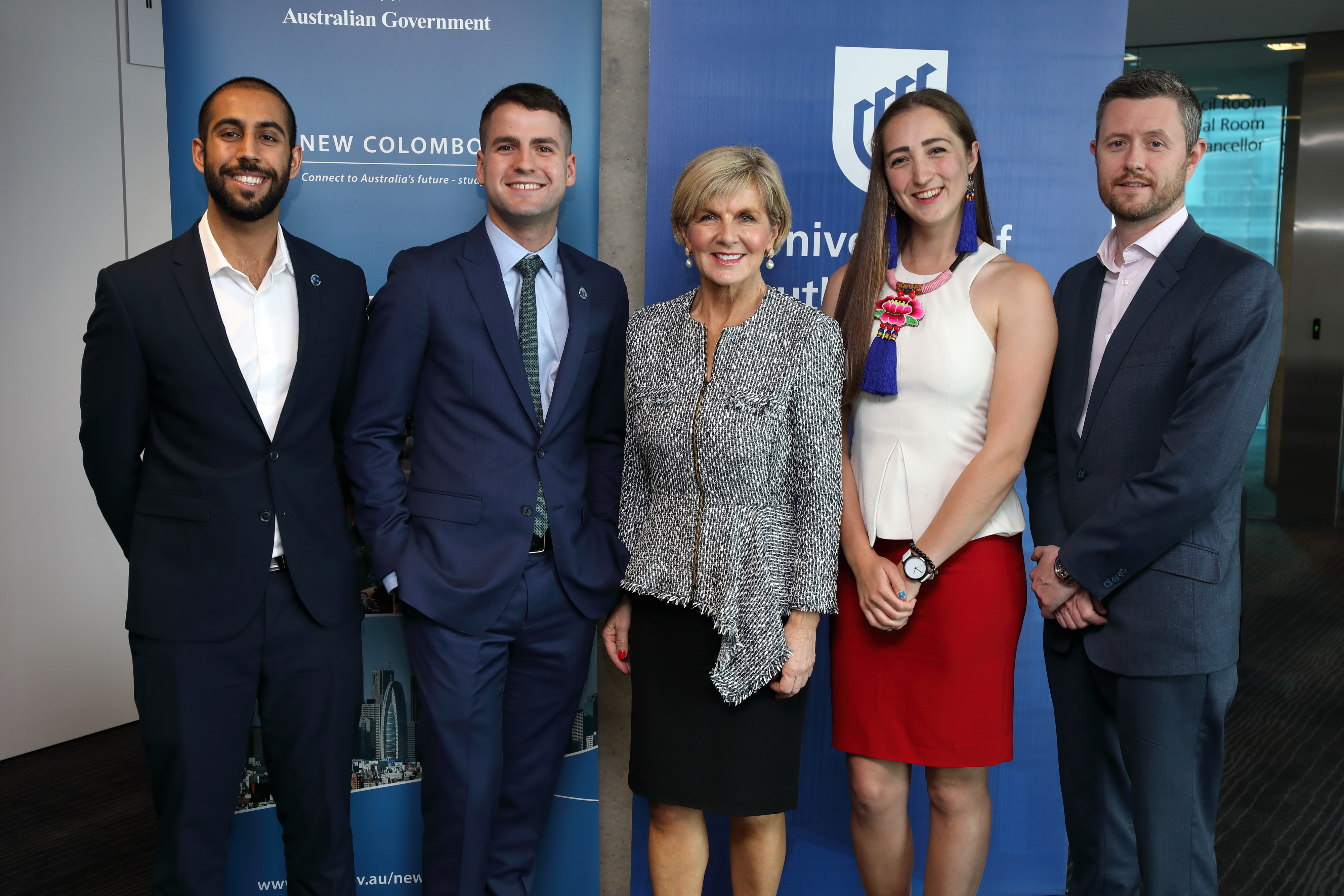 Foreign Minister Julie Bishop at the South Australian New Colombo Plan Alumni launch with Fawaaz Karim, Alumni Ambassador, Flinders University; Charlie Hamra, Alumni Ambassador, University of Adelaide; Foreign Minister; Michelle Howie, Alumni Ambassador, University of South Australia and Professor David Lloyd, Vice Chancellor and President, University of South Australia. Adelaide, 6 October 2017.