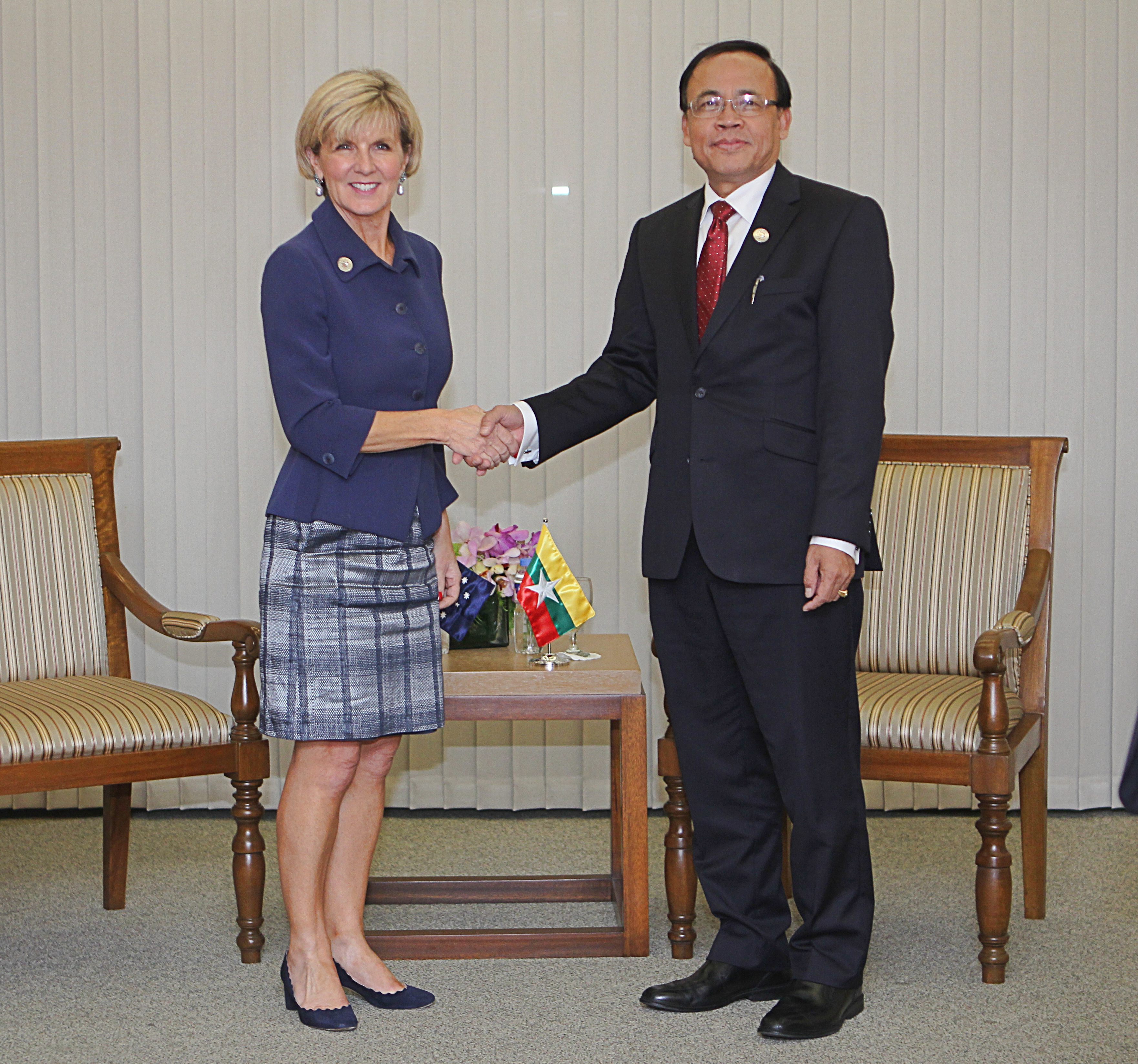 Foreign Minister Julie Bishop meeting with Myanmar’s State Minister of Foreign Affairs, Kyaw Tin in Manila to discuss strong bilateral relations, 6 August 2017.