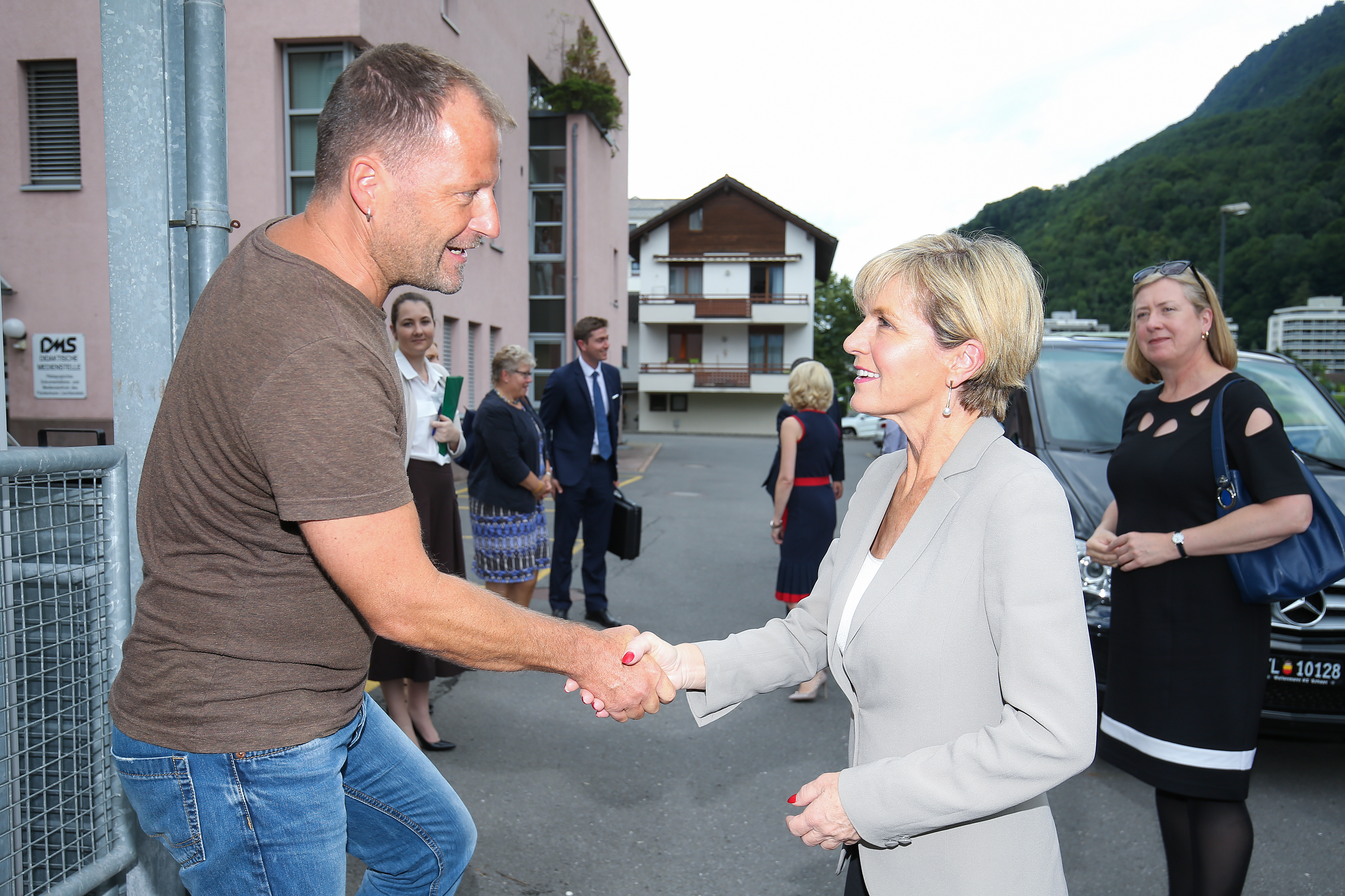 Foreign Minister Julie Bishop meets LieLa trainer and board member Martin Beck in Vaduz, Liechtenstein on 12 July.