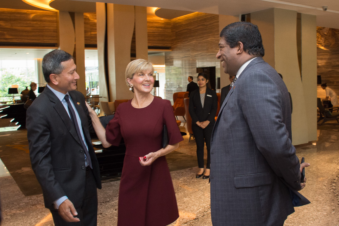 Foreign Minister Julie Bishop, Sri Lankan Foreign Minister Ravi Karunanayake and Singaporean Foreign Minister Vivian Balakrishnan meeting in Colombo on 20 July 2017.