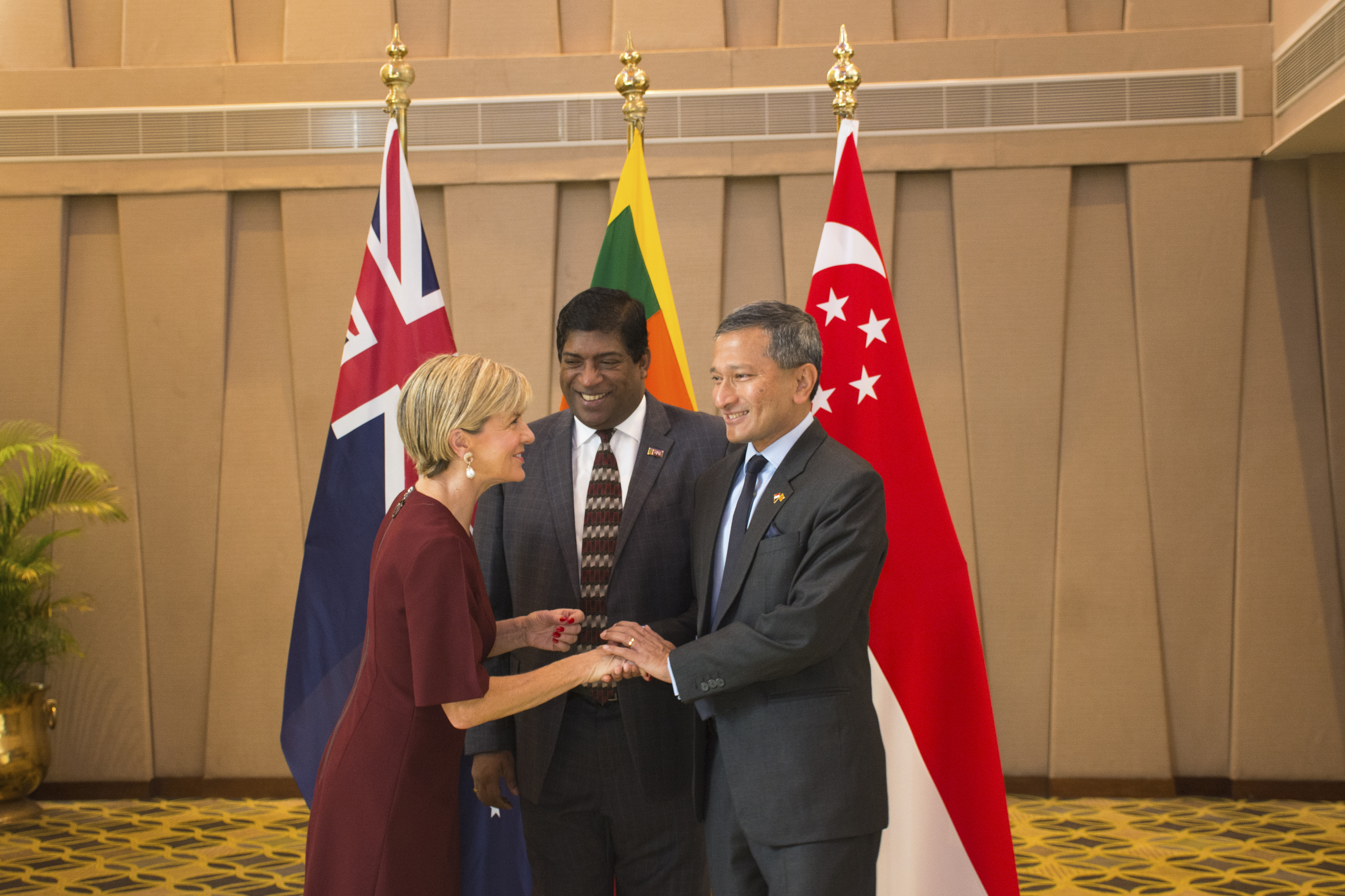 Foreign Minister Julie Bishop, Sri Lankan Foreign Minister Ravi Karunanayake and Singaporean Foreign Minister Vivian Balakrishnan meeting in Colombo on 20 July 2017.