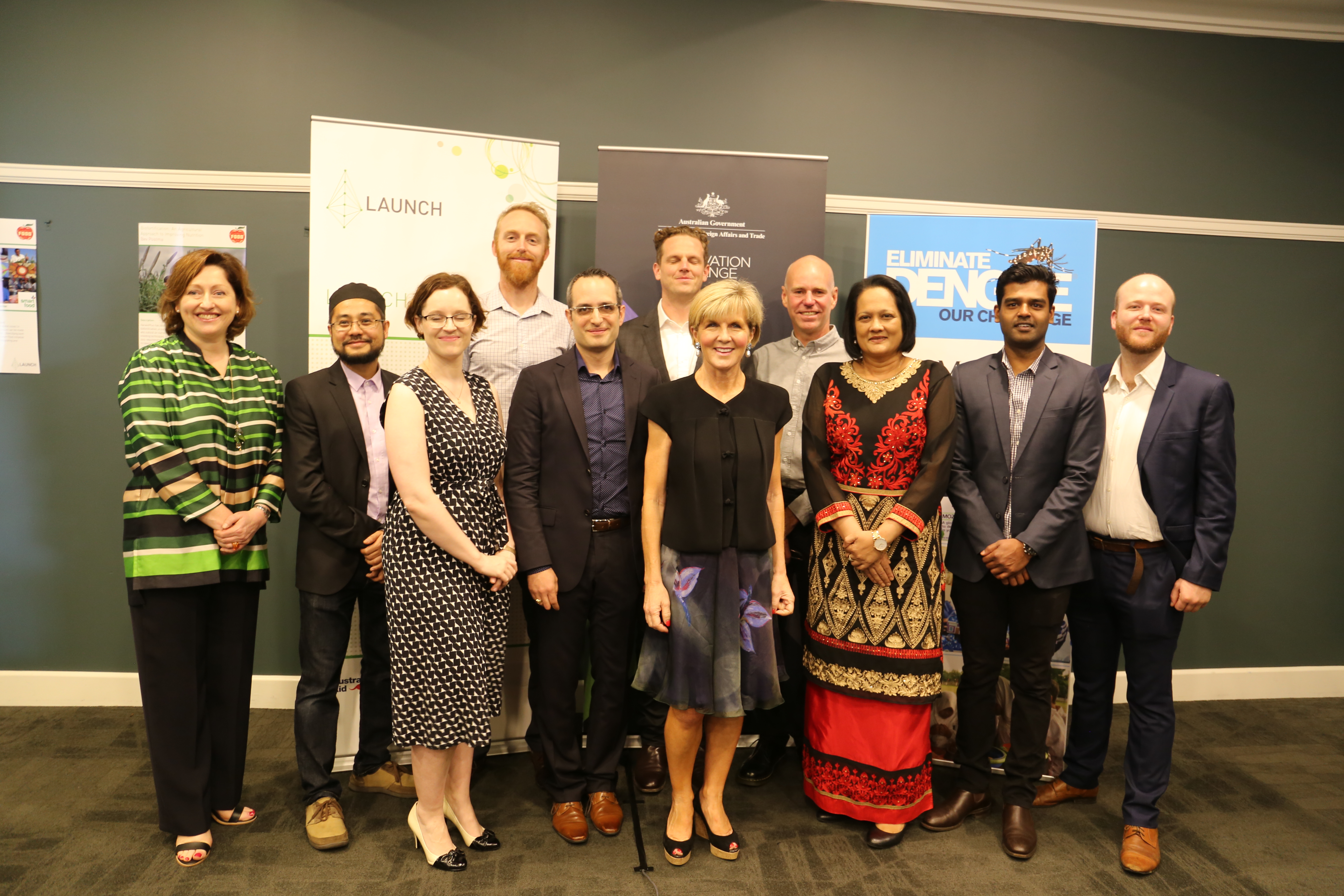 While in Fiji, Minister Julie Bishop launched two new innovationXchange initiatives to combat disease and improve nutrition in the Pacific. She is pictured here at the launch with Fiji’s Minister for Health and Medical Services, the Hon Rosy Akbar, LAUNCH Food challenge winners and representatives from the Monash University Eliminate Dengue Program.