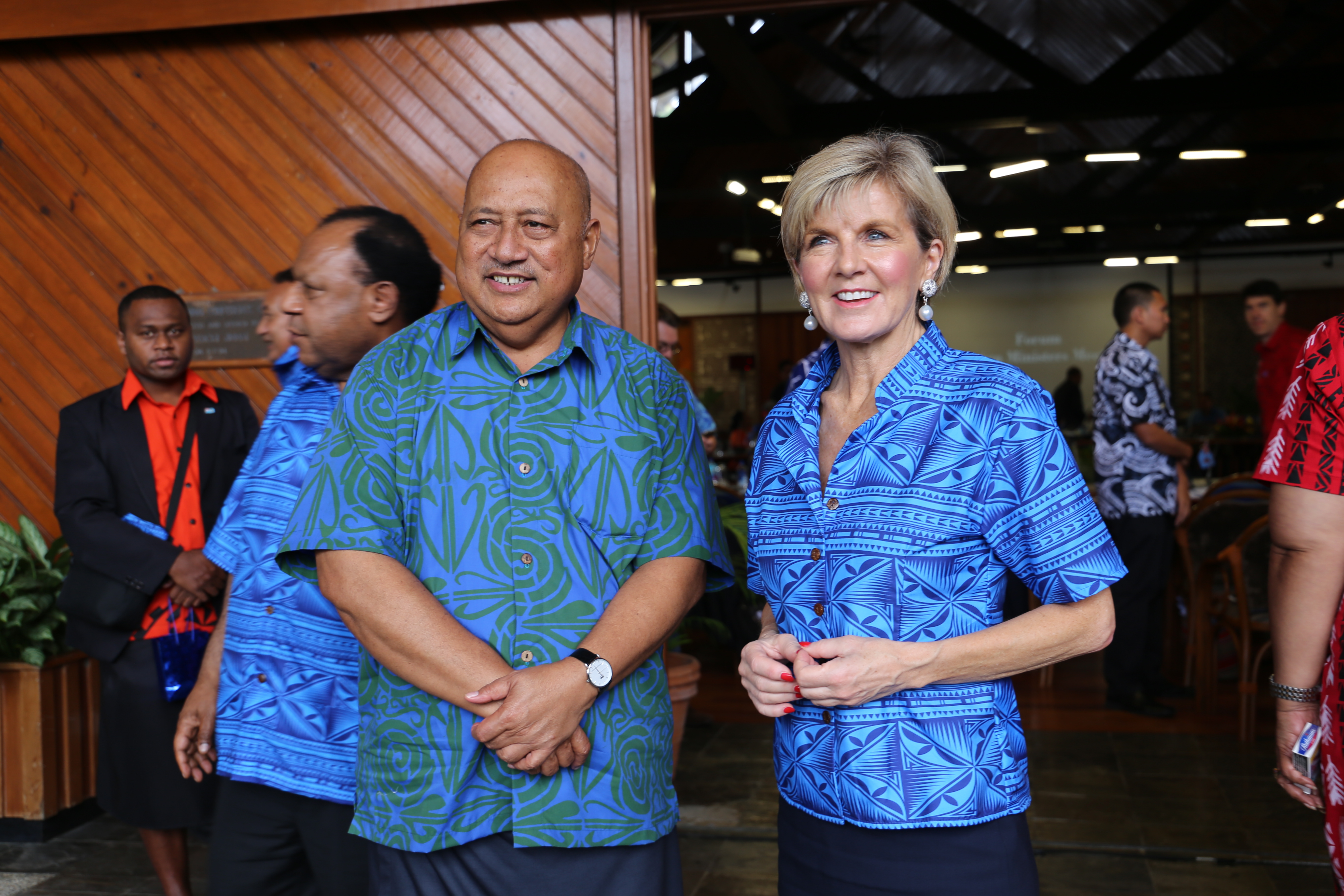 Foreign Affairs Minister Julie Bishop shares a light moment with Fiji’s Defence and National Security Minister, Ratu Inoke Kubuabola at the Pacific Islands Forum Foreign Ministers’ Meeting in Suva, 11 August 2017.