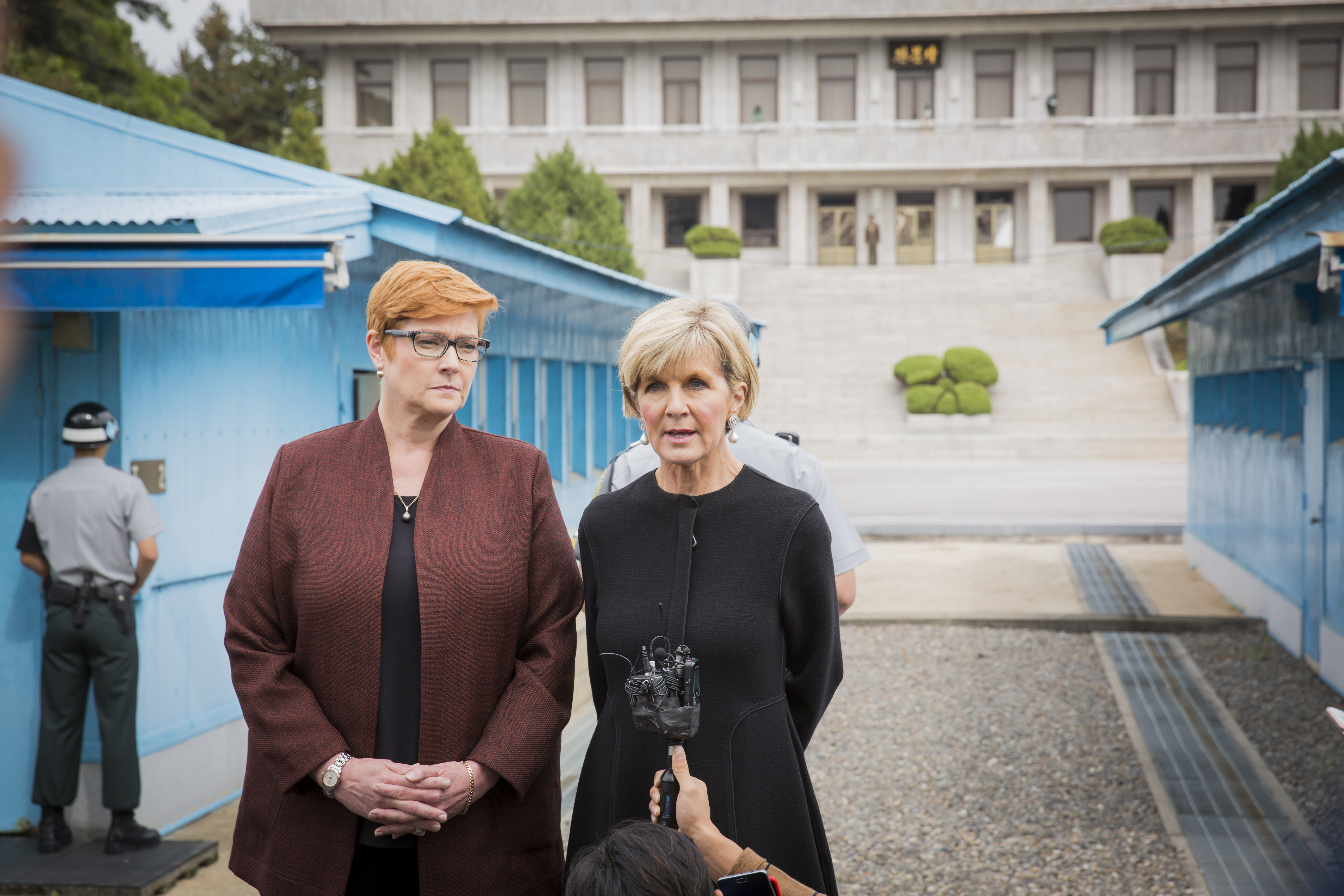 Defence Minister, Marise Payne and Foreign Minister, Julie Bishop holding a doorstop at the Joint Security Area, DMZ.
