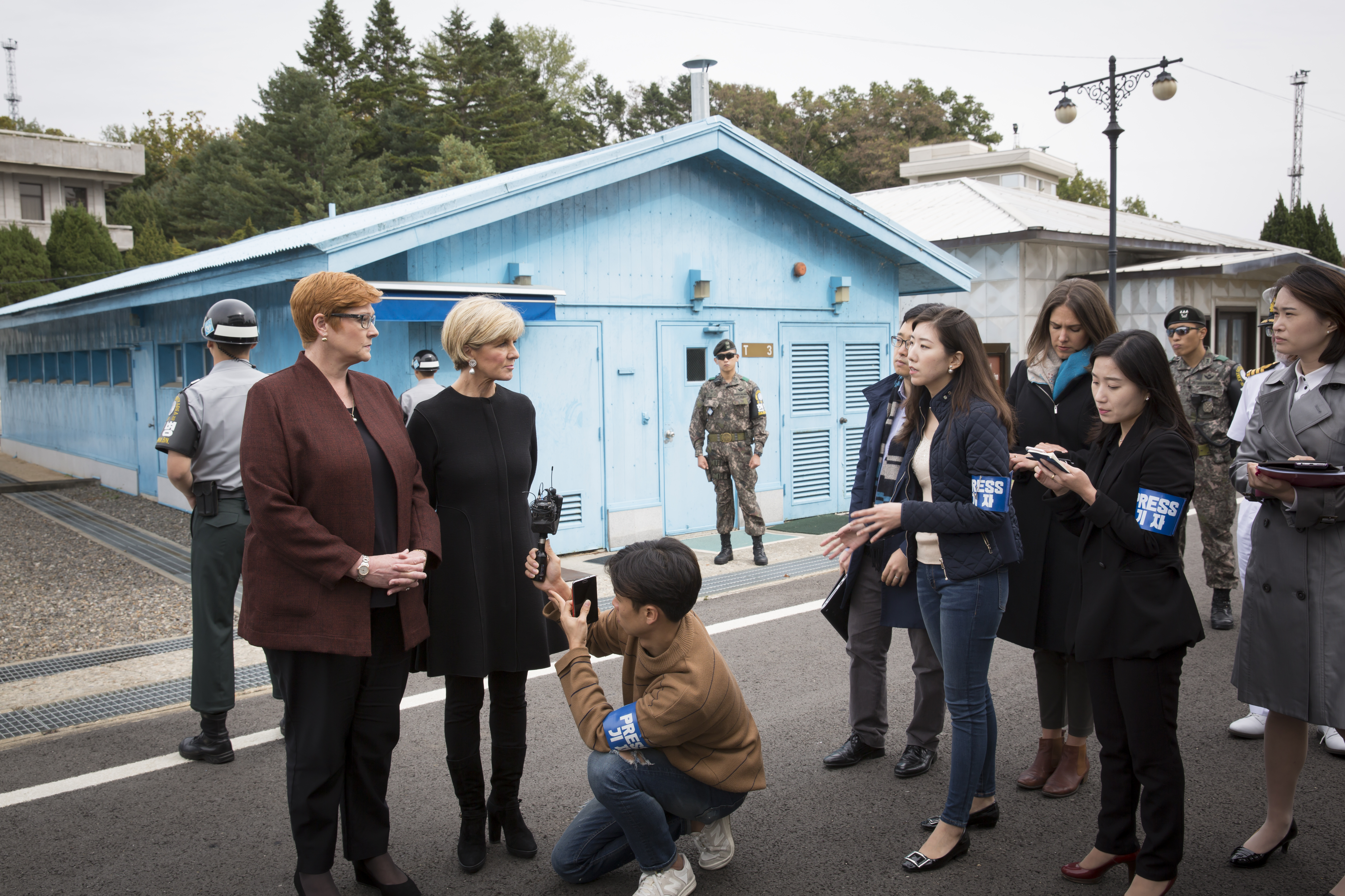 Defence Minister, Marise Payne and Foreign Minister, Julie Bishop holding a doorstop at the Joint Security Area, DMZ.