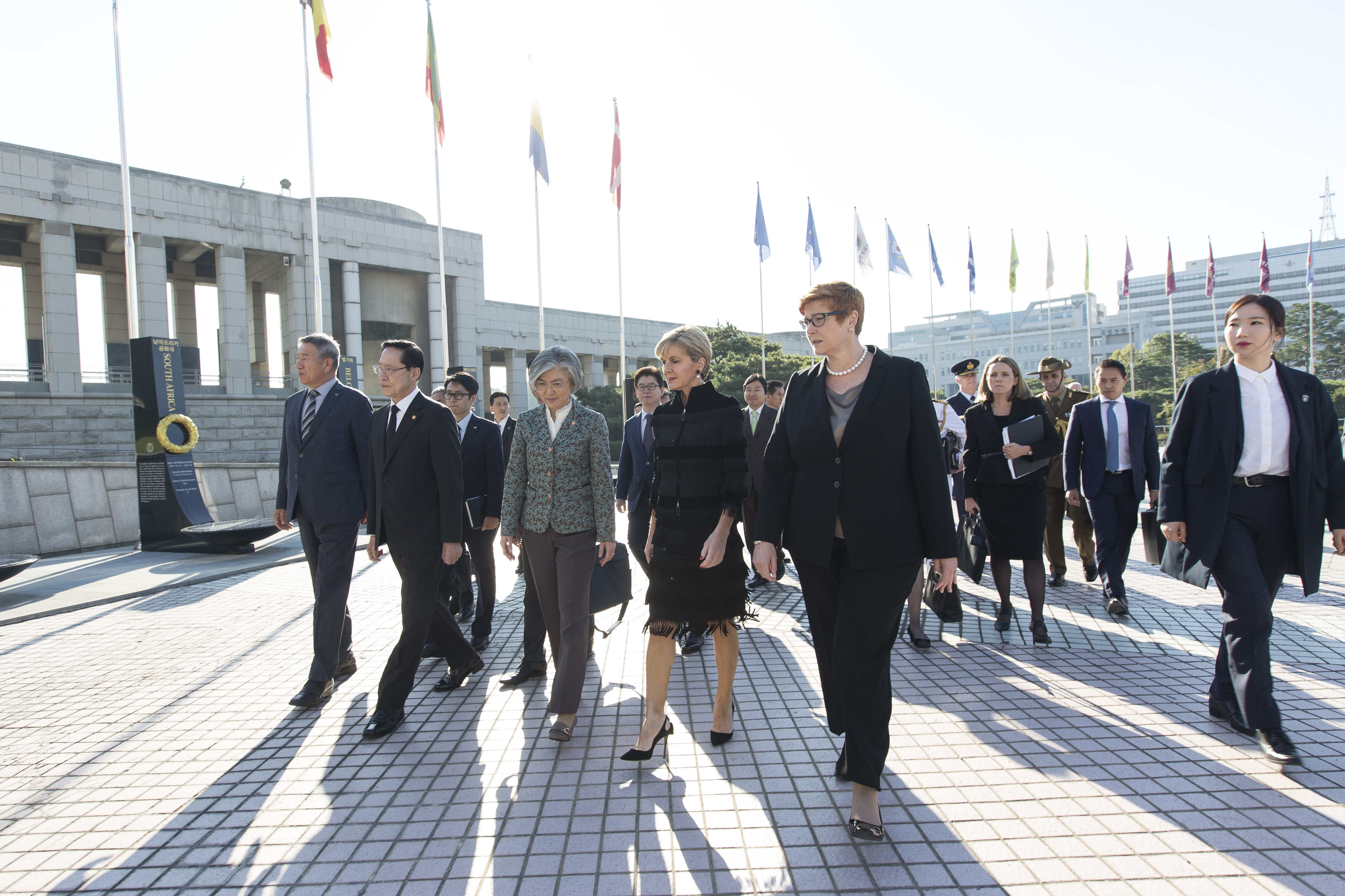General Director of the War Memorial of Korea Lee Young-gye, ROK Defence Minister Song Young-moo, ROK Foreign Minister, Kang Kyung-wha, Foreign Minister Julie Bishop, Defence Minister Marise Payne walking into the War Memorial of Korea.