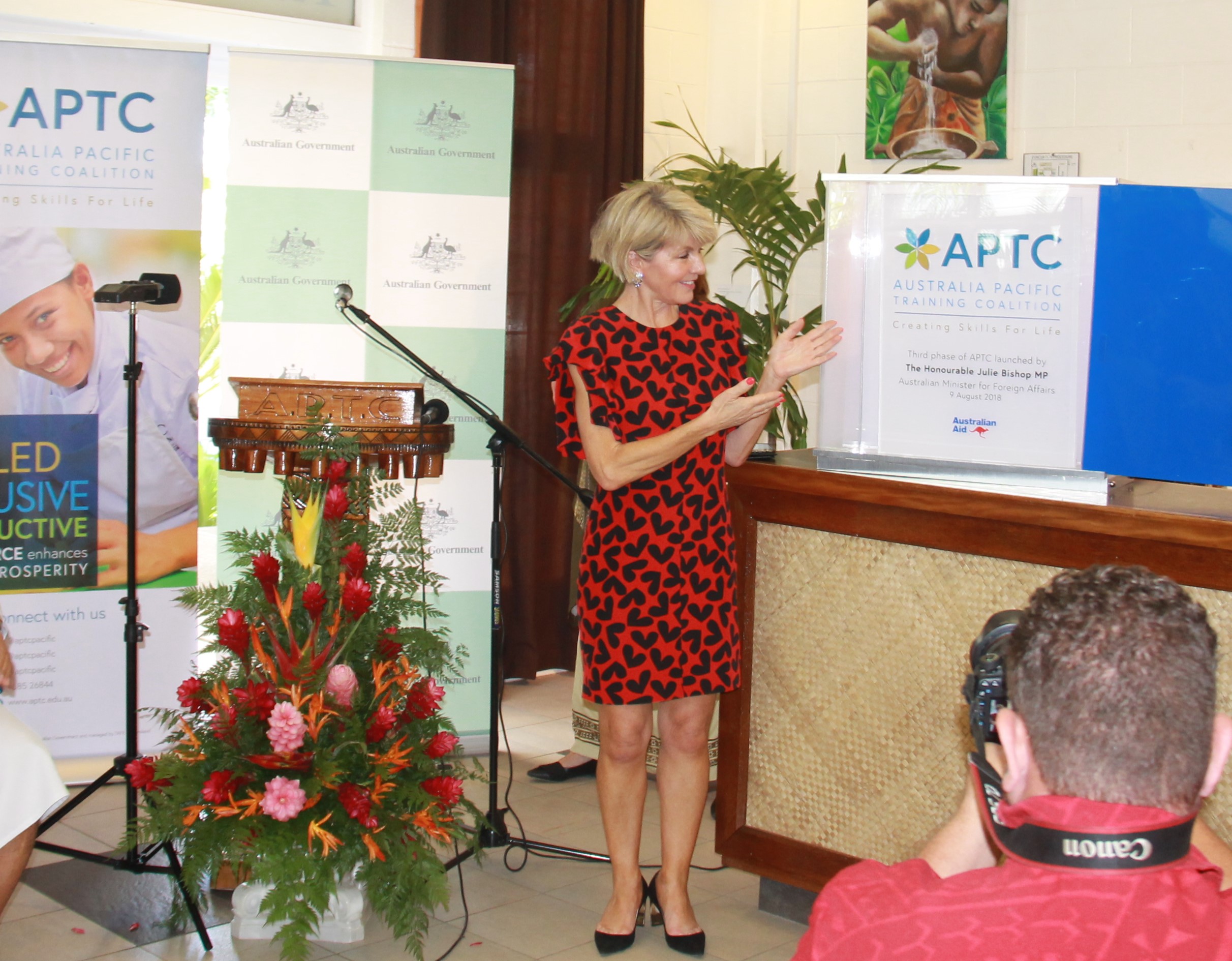 Foreign Minister Julie Bishop launched the third phase of the Australia Pacific Technical College, including its rebadging as the Australia Pacific Training Coalition, still to be known as APTC in Samoa on Thursday 8 August 2018.