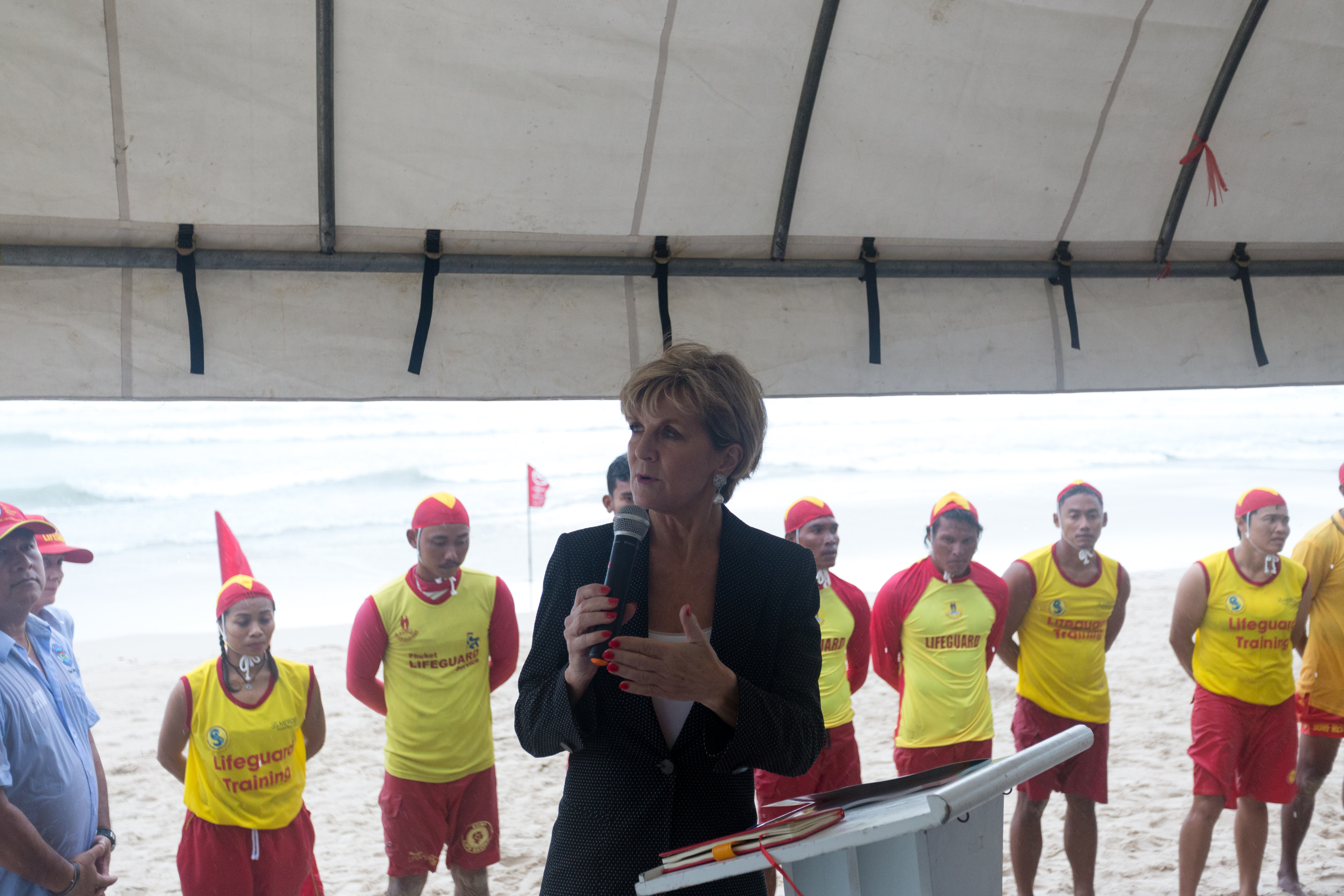 Foreign Minister Julie Bishop delivers remarks to announce the first Thai language lifesaving manual and teaching curriculum at Patong beach in Phuket. Thailand, Phuket, 4 August 2017.